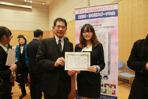 在由日本侨报社中日交流研究所和日本驻中国大使馆共同主办的“第11届中国人日语作文大赛”中,我院日语系13级学生于洁同学荣获二等奖、张钰同学荣获佳作奖。2015年12月12日下午,该大赛颁奖仪式在北京日本驻中国大使馆举行。