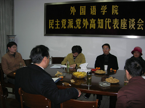 2011年12月8日下午,外国语学院在9楼会议室召开了民主党派及党外高知代表座谈会。全体院领导、民主党派、党外高知代表20余人参加了此次会议,会议由党委书记朱清同志主持。