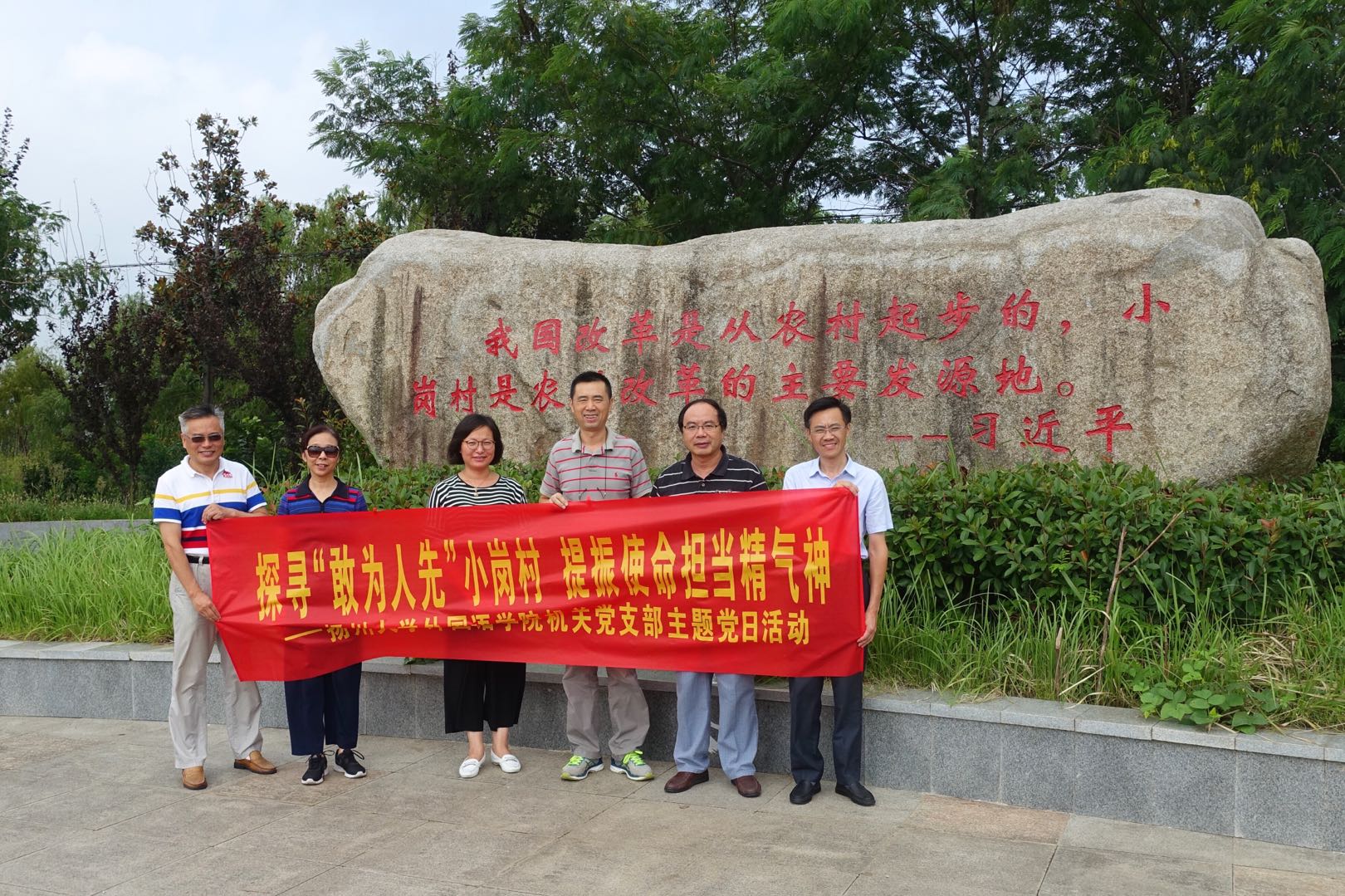 为深入学习贯彻习近平新时代中国特色社会主义思想,庆祝改革开放40周年,2018年8月22日,外国语学院机关党支部全体党员在院党委书记刘胜乐的带领下,赴安徽省凤阳县小岗村开展了“探寻敢为人先小岗村,提振使命担当精气神”主题党日活动。