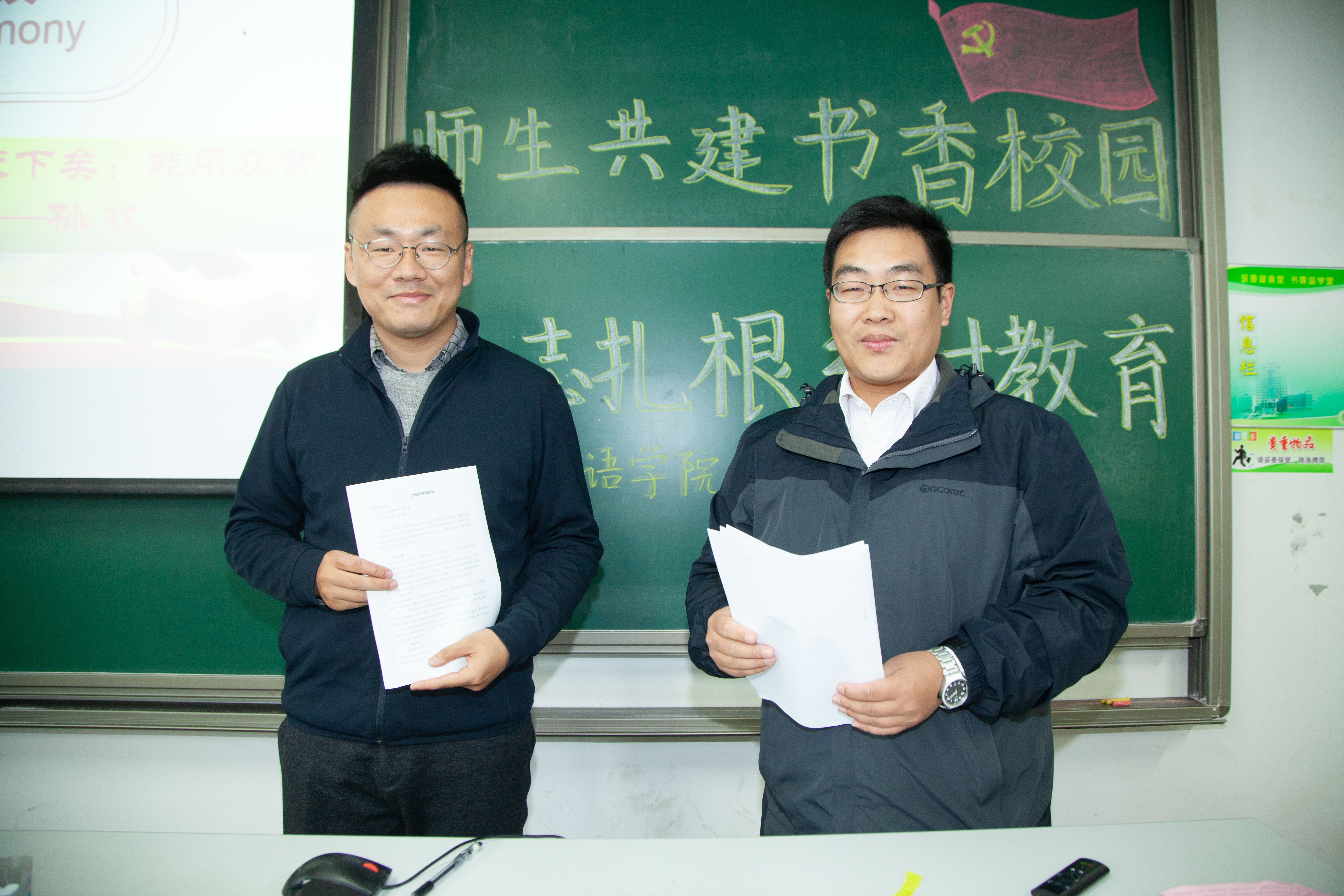 “知者行之始,行者知之成”,学院在师范生培养过程中重视知识积累、技能锻炼、行为养成、师德提升“四位一体”的模式,活动现场专业教师第一党支部副书记季小民、学生第一党支部书记宋超老师签订支部结对共建协议,党员同学带头展示风采:蒋馨怡同学模拟课堂幽默风趣,精彩十足;习语书法,中英对照,笔力遒劲的毛笔字及秀气流畅的粉笔字展现着师范生们对于教师的理解与学涯的目标——扎根乡村志在育人,圆梦扬大青春无悔。学院副院长缪海涛老师深有体会:“学高为师、身正为范,作为外语类的乡村定向师范生,既要掌握专业知识,能教书、教得好,更要有“世界那么大、我要回乡村”的情怀,下得去、留得住,将专业展示与党课学习结合起来,可以起到很好的效果。”