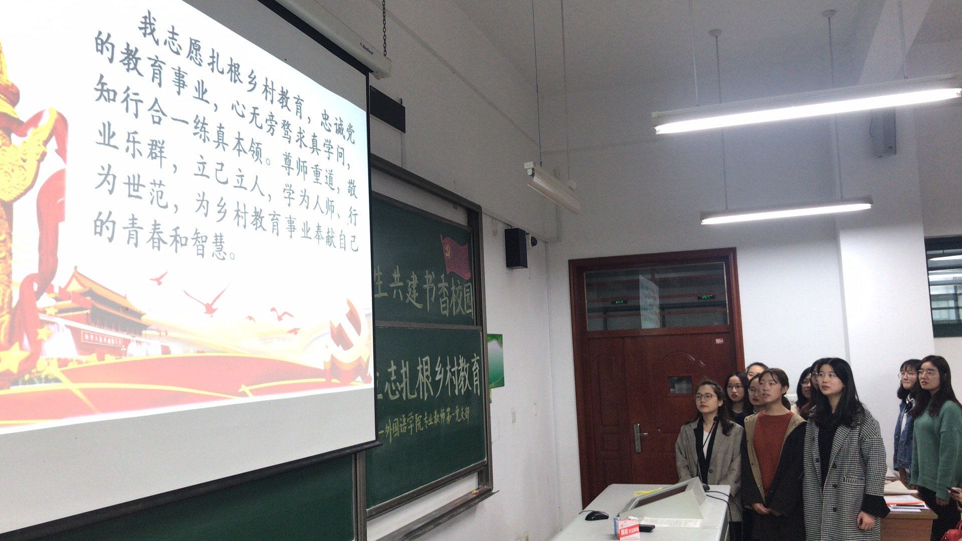 “我志愿扎根乡村教育,忠诚党的教育事业,心无旁骛求真学问,知行合一练真本领。尊师重道,立己立人,学为人师、行为世范,为乡村教育事业奉献自己的青春和智慧。”这铿锵有力的笃行宣言是来自扬州大学外国语学院的一次党日活动。据了解,为响应十九大提出的‘乡村振兴战略’,围绕乡村定向师范生培养等主题,这一活动谋划已久。