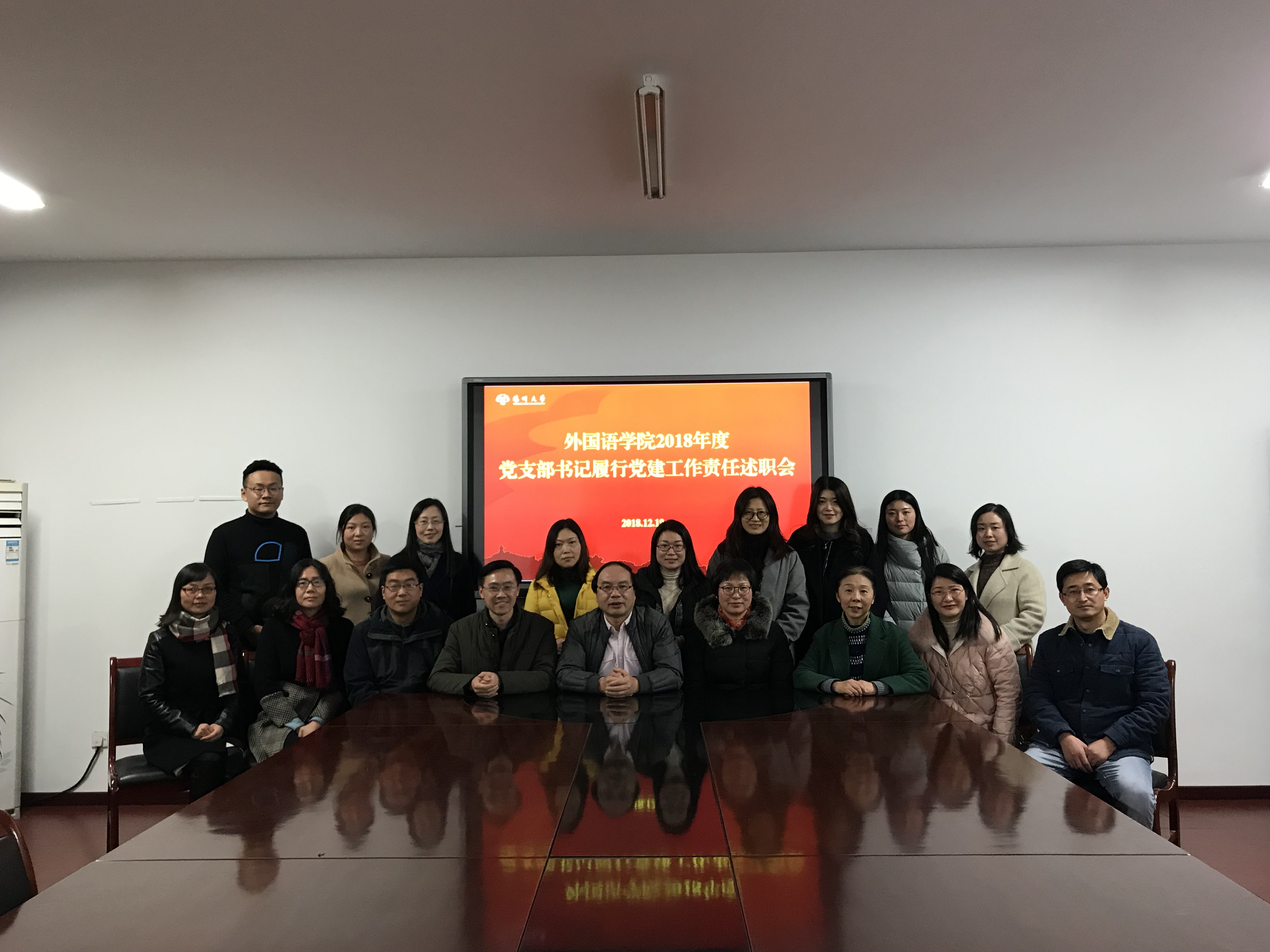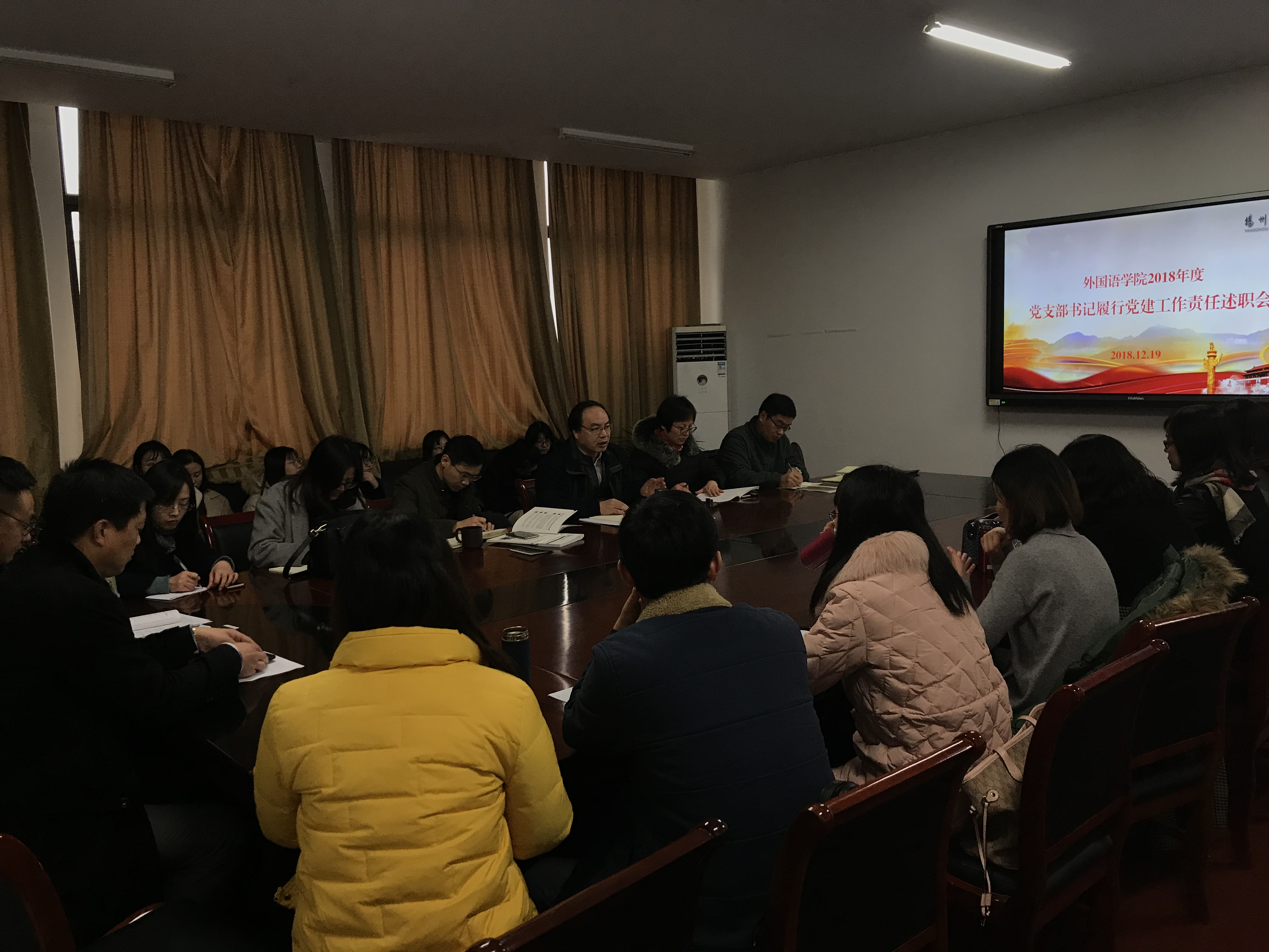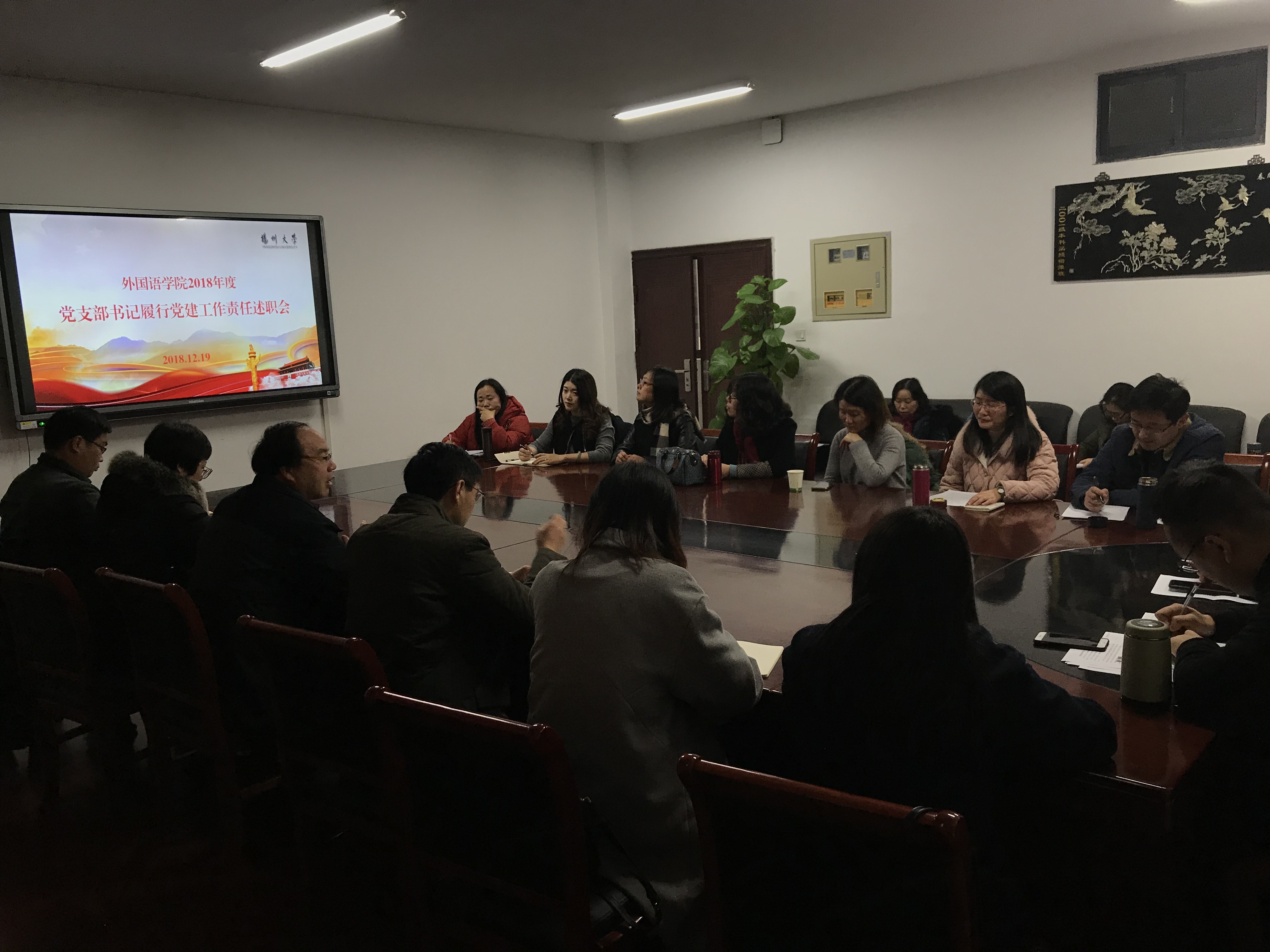 12月19日,外国语学院2018年度党支部书记履行党建工作责任述职会在笃行楼会议室举行。学院党委书记刘胜乐、副书记崔益军,学院综合办公室主任袁玫玫、团委书记刘芳玮及各支部书记、委员参加会议。