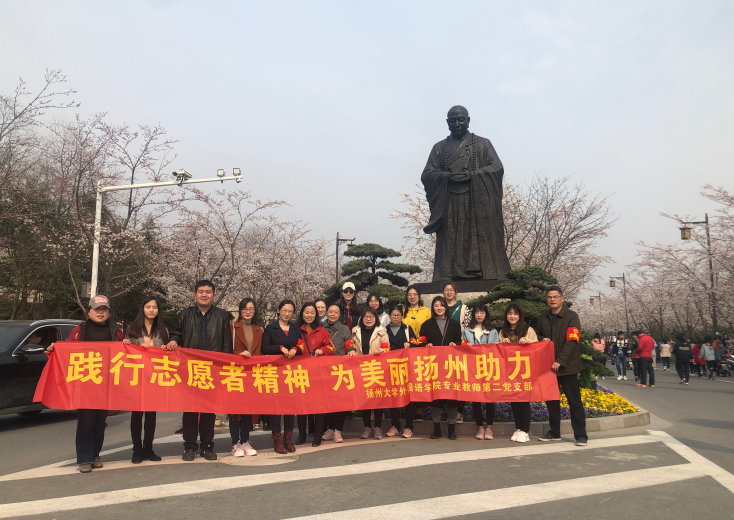 3月24日下午,外国语学院专业教师第二党支部携手扬州交警支队执勤交警、部分日语16级同学,前往扬州市鉴真樱花大道十字路口,举行了“践行志愿者精神,为美丽扬州助力”的公益活动。