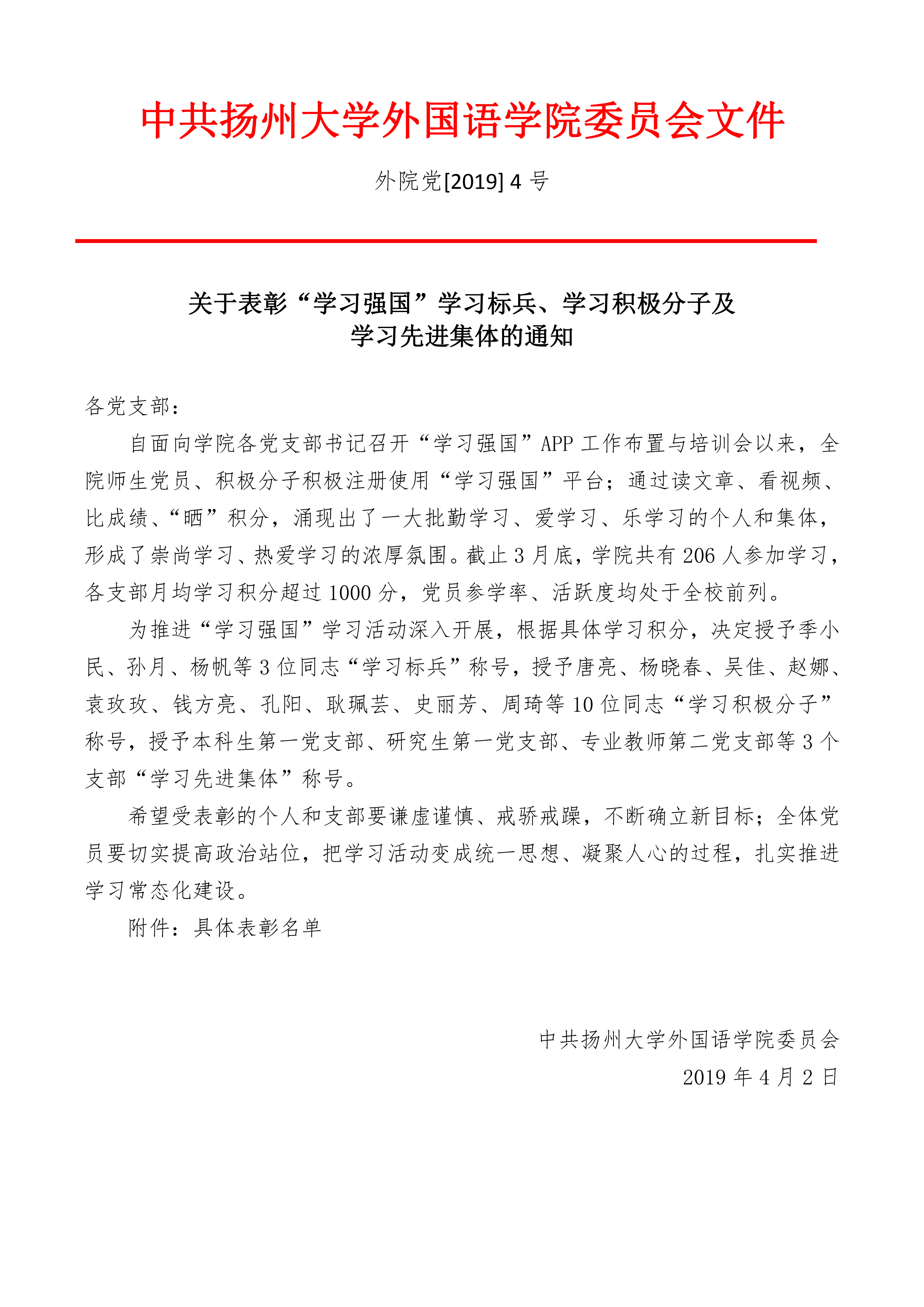 关于表彰“学习强国”学习标兵、学习积极分子及学习先进集体的通知