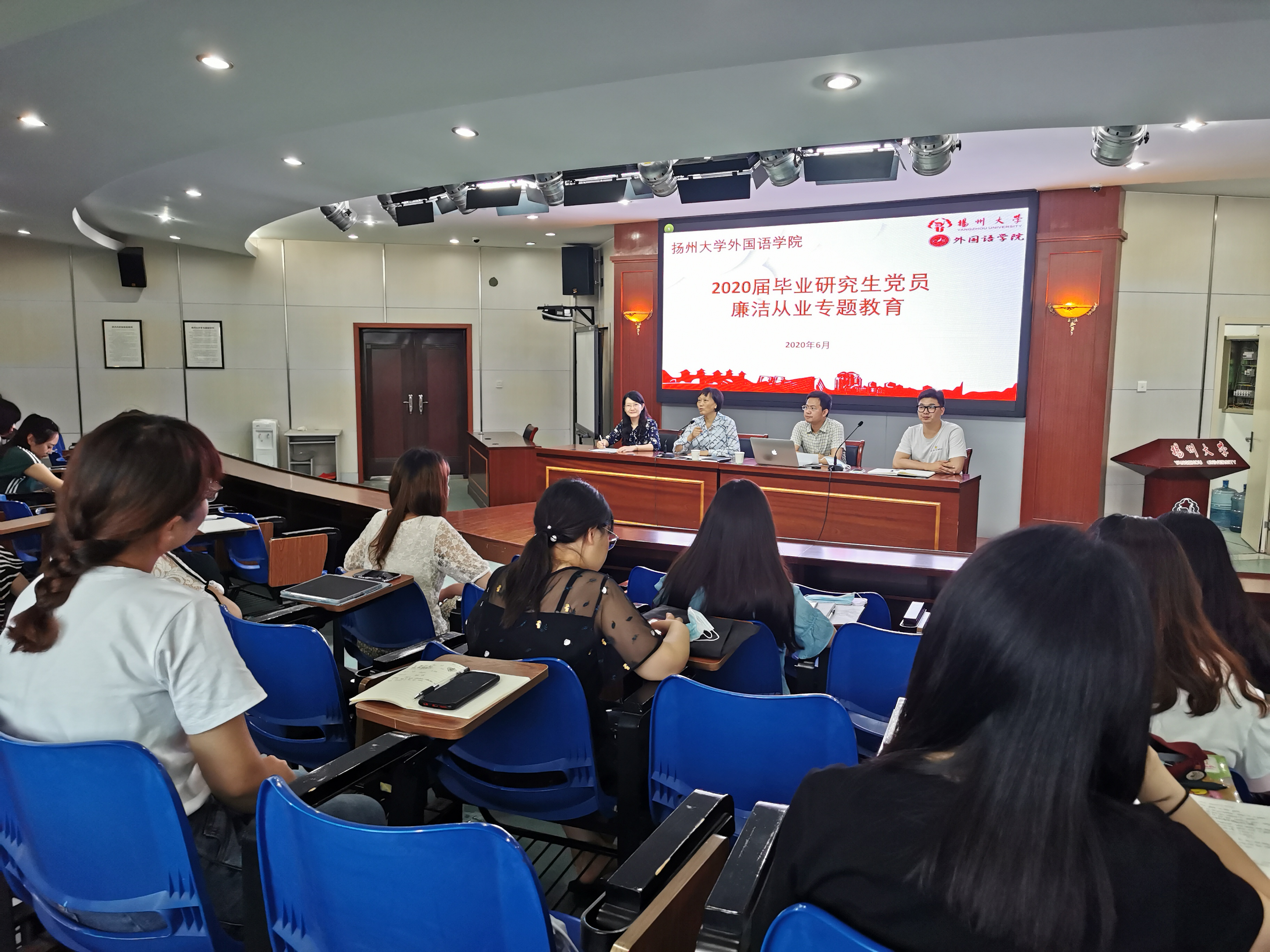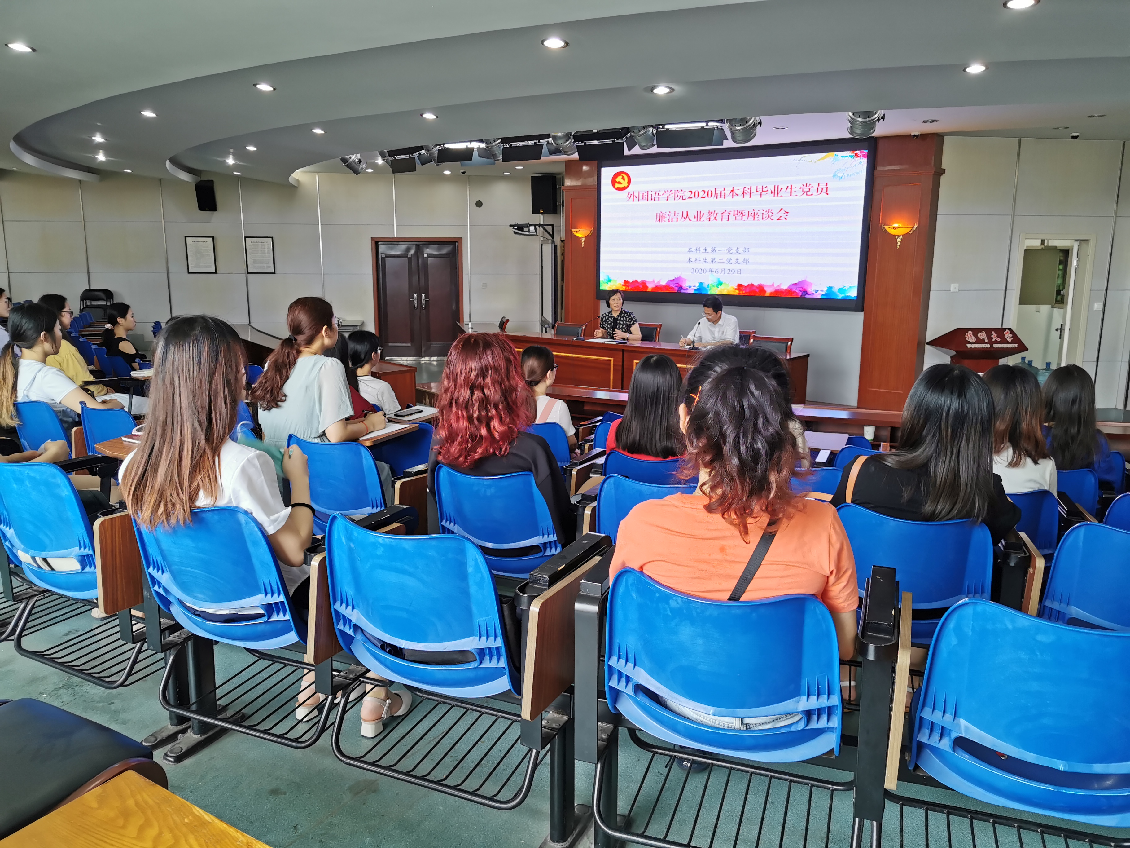6月23日、6月29日,学院在笃行楼报告厅分批次对2020届本科生、研究生毕业生党员进行廉洁从业教育暨毕业生座谈会。会议由外国语学院党委副书记毛连军主持,学院党委书记赵春丹为同学们做专题报告。各支部书记、全体毕业生党员参加会议。