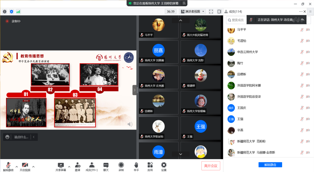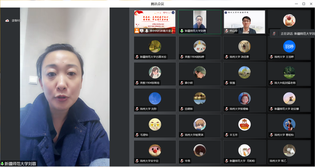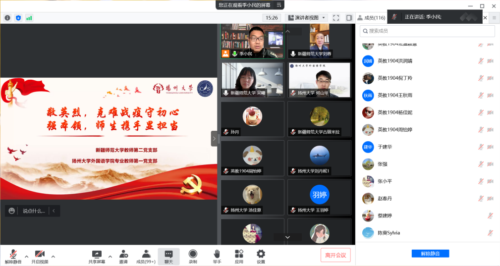 扬州大学外国语学院赵春丹、副院长何山华、专业教师第一党支部书记季小民,新疆师范大学外国语学院刘蓉、副院长古海波、教师第二党支部书记吴曦出席,来自各支部的教师党员、交流班级学生120余人参加此次线上主题党日活动。
