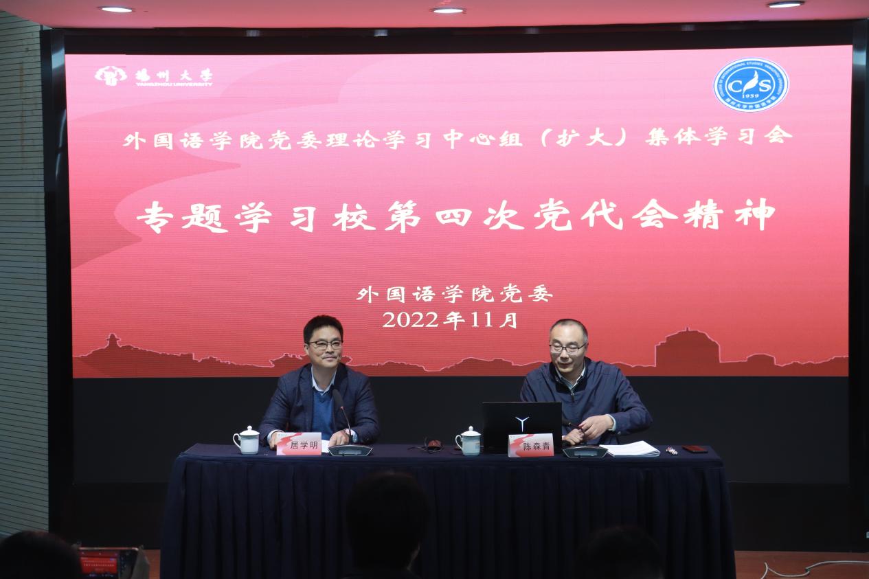11月2日,外国语学院举行党委理论学习中心组(扩大)集体学习会,专题学习校第四次党代会精神。本次学习会邀请党委办公室(保密办公室)副主任、校第四次党代会筹备工作领导小组办公室秘书组成员陈森青作专题导学。