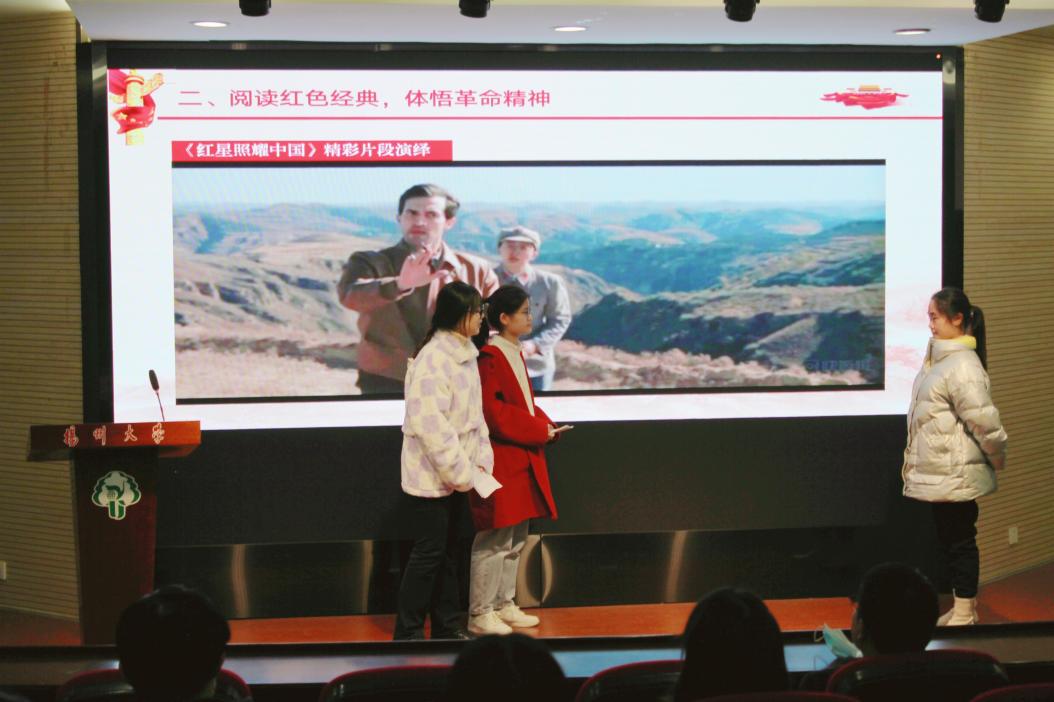 “一艘小船,一天短会,一个大党在此诞生。”活动伊始,全体成员一起观看了记录中共一大红船启航的相关电影片段,在观看中大家共同感悟我党开天辟地、敢为人先的首创精神。刘畅等同学带来“红星照耀中国”经典片段演绎,为大家讲述中国共产党的革命精神如红星般照耀着中国和世界的故事。王梓任和刘童洁等同学则为大家介绍了二十大代表的产生过程及二十大代表们的故事。同学们感情饱满、语气热忱,在场同学都纷纷表示要讲好党的故事,传承红色基因。随后曹吴越、蒋轩等用多语种朗诵经典“习”语,表达“继续跟党走,奋进新时代”的决心。活动在昂扬的《国际歌》歌声中结束。
