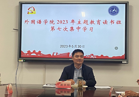 5月30日下午,外国语学院学习贯彻习近平新时代中国特色社会主义思想主题教育读书班开展第七次集中学习研讨,主题为“坚定不移高举中国特色社会主义伟大旗帜”。院党委书记居学明主持学习研讨会。