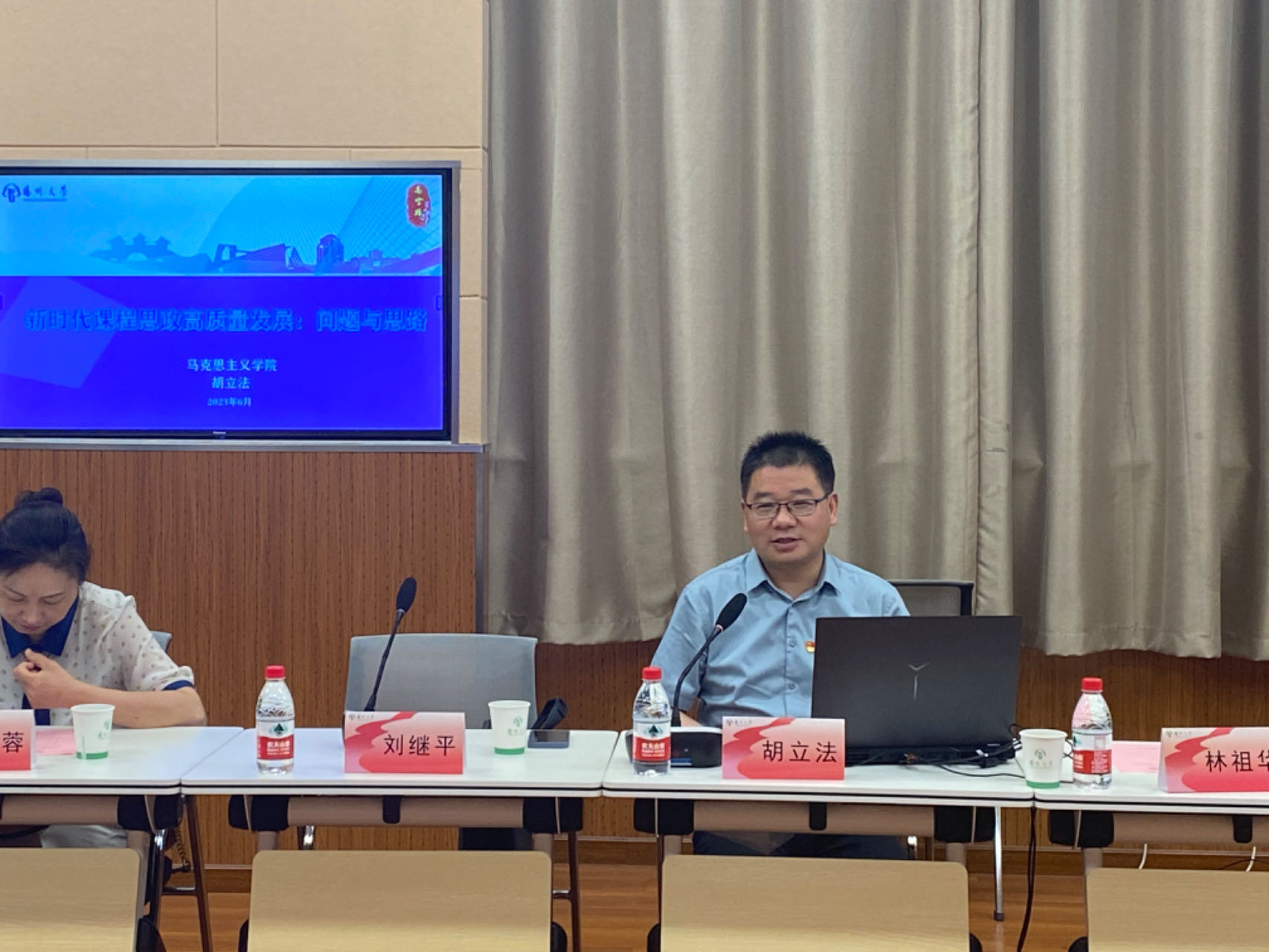 会议第二项议程为“课程思政”建设讨论交流。胡立法教授全面地分析了新时代“课程思政”高质量建设存在的问题和建设的思路,他指出,“课程思政”实施过程中在建设理念、整体设计、实施路径等方面还存在着许多共性问题,急需我们转变思路,真正发挥“课程思政”在落实立德树人根本任务、全面提高人才培养质量中的主要作用。他强调,“课程思政”建设应以高质量的思想政治理论课为前提,以高素质的师资队伍为基础,充分挖掘校本资源、地方资源、课程资源、人力资源,经过细致深入的研究论证,设计适合本校的“课程思政”方案。我院副院长杨晓春、各系部主任针对不同课程的“课程思政”元素挖掘和教学方式方法与马克思主义学院的与会专家进行了交流探讨。