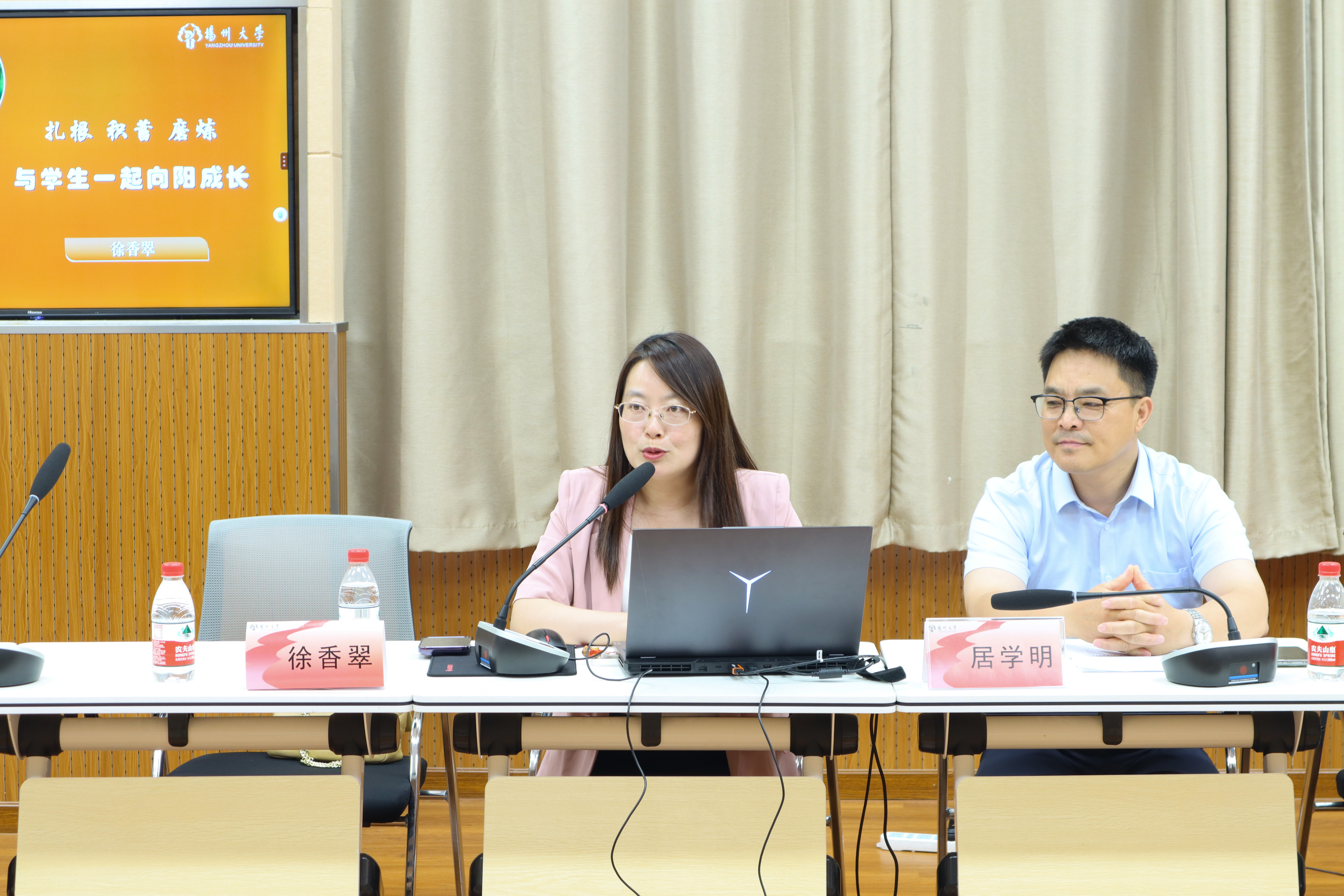 徐香翠曾获评“江苏高校最美辅导员”。她结合自身的成长经历,以“扎根、积蓄、磨炼——与学生一起向阳成长”为主题分享了学生工作的心得体会。她指出,辅导员要坚持向下扎根。正如演员张颂文所说“枝繁叶茂是你可以看见的,但是支撑枝繁叶茂的是它的根系,只有根扎得越深,扎得越牢,有朝一日,才可以绽放出一朵漂亮的花。”辅导员们同样需要这样一种“向下扎根”的力量,承受向下扎根时的平淡、寂寞与煎熬,汲取向上生长的力量,在“泥泞”中获取成长的营养,经风雨、壮筋骨、长才干。她表示,辅导员要善于积蓄能量。要在工作过程中学会观察、善于思考、勤于总结,注重积蓄点滴,吸收营养,汲取力量,从而获得更快的成长。她强调,辅导员要注重磨炼成长。不仅要学会自我修炼,更要懂得事中磨砺,要始终牢记“打铁必须自身硬”的道理。注意运用“六大思维”指导工作实践,面对复杂的工作任务时要学会“心理调适”。