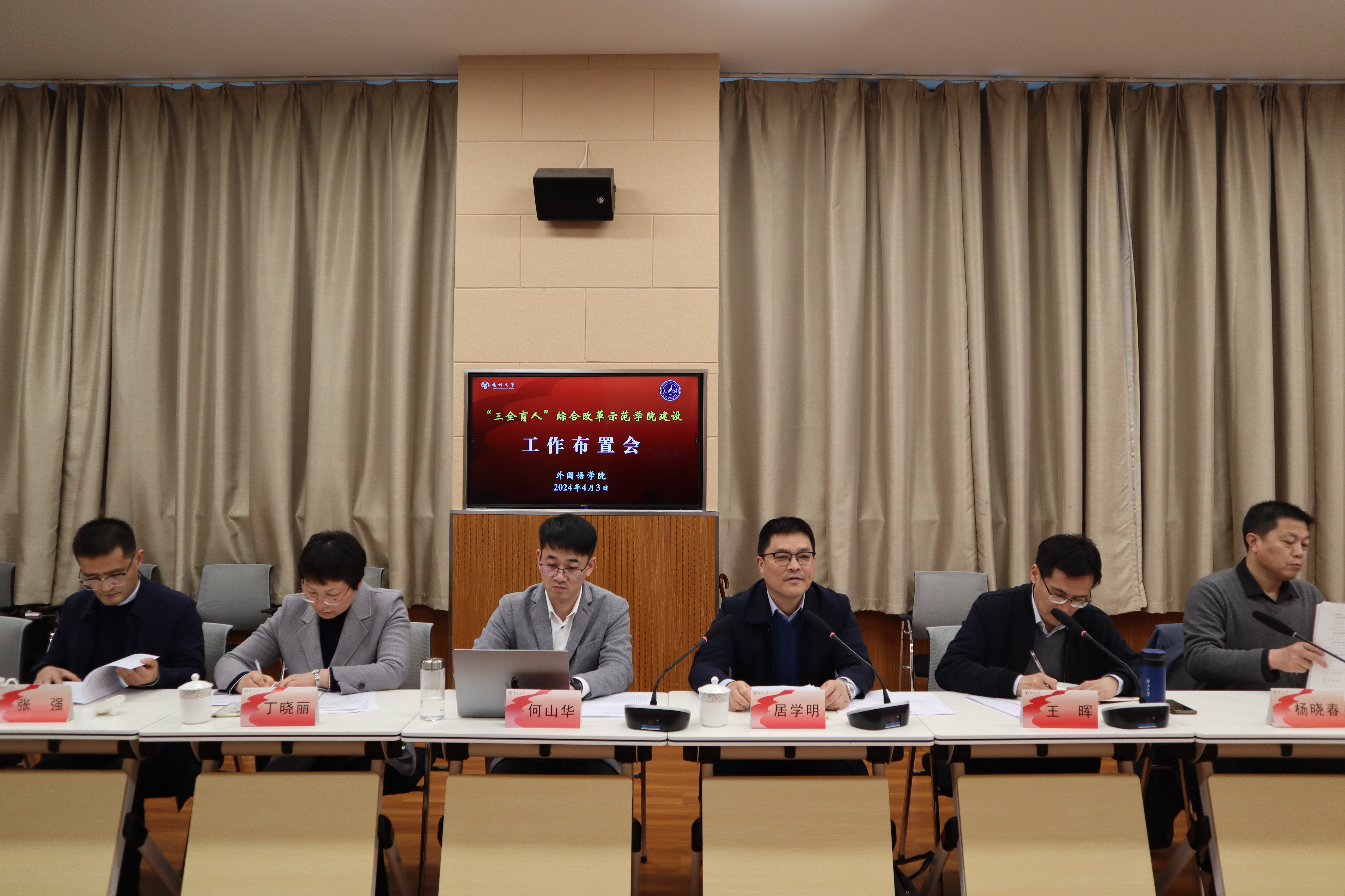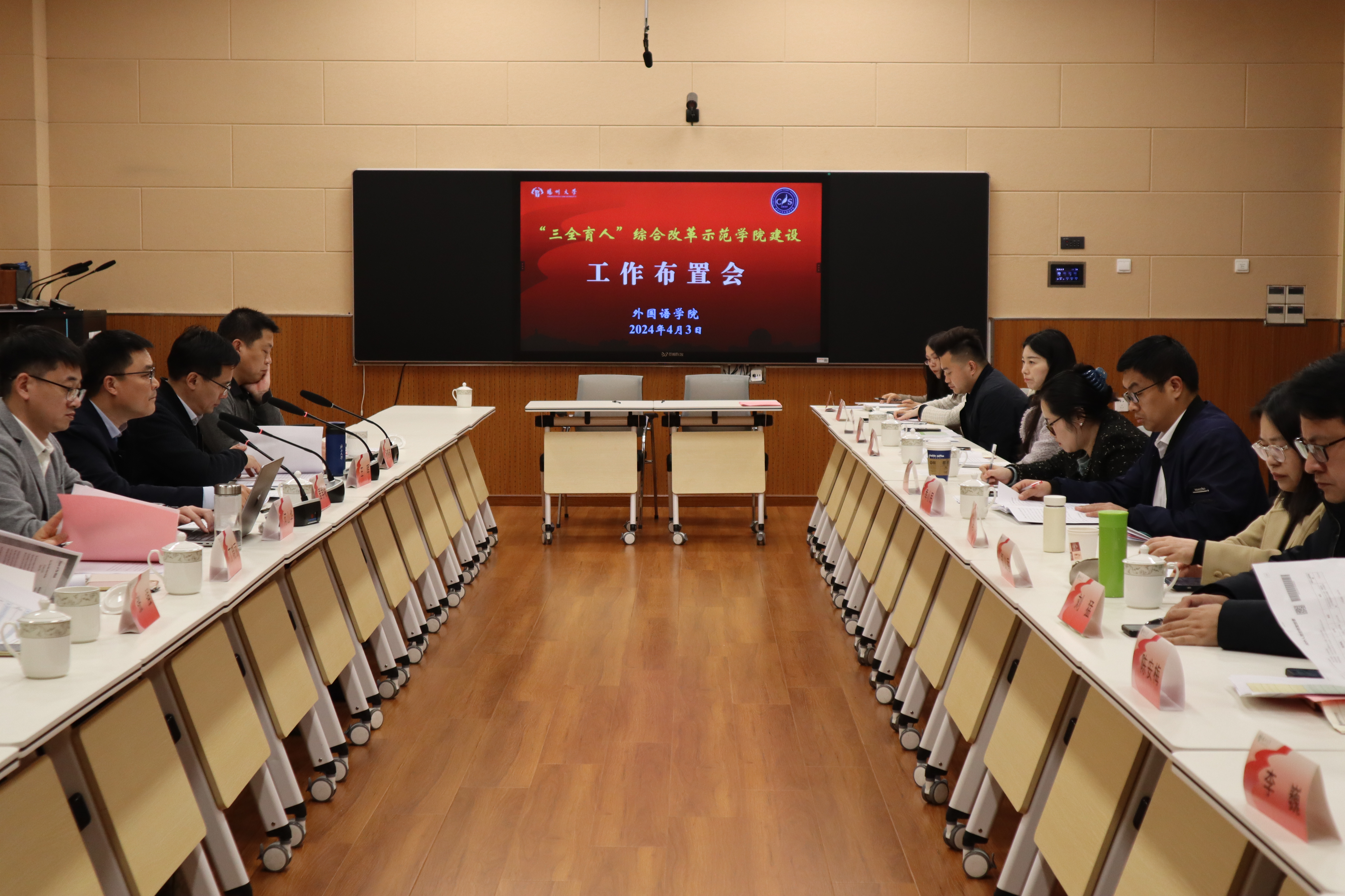 4月3日下午,我院在文津楼N409会议室召开“三全育人”综合改革示范学院建设工作布置会,会议由院党委书记居学明主持,全体院领导、党委委员、各系(部)主任、教育硕士管理中心主任、翻译硕士管理中心主任、研究生导师代表、全体科级以上干部、院工会主席参加活动。