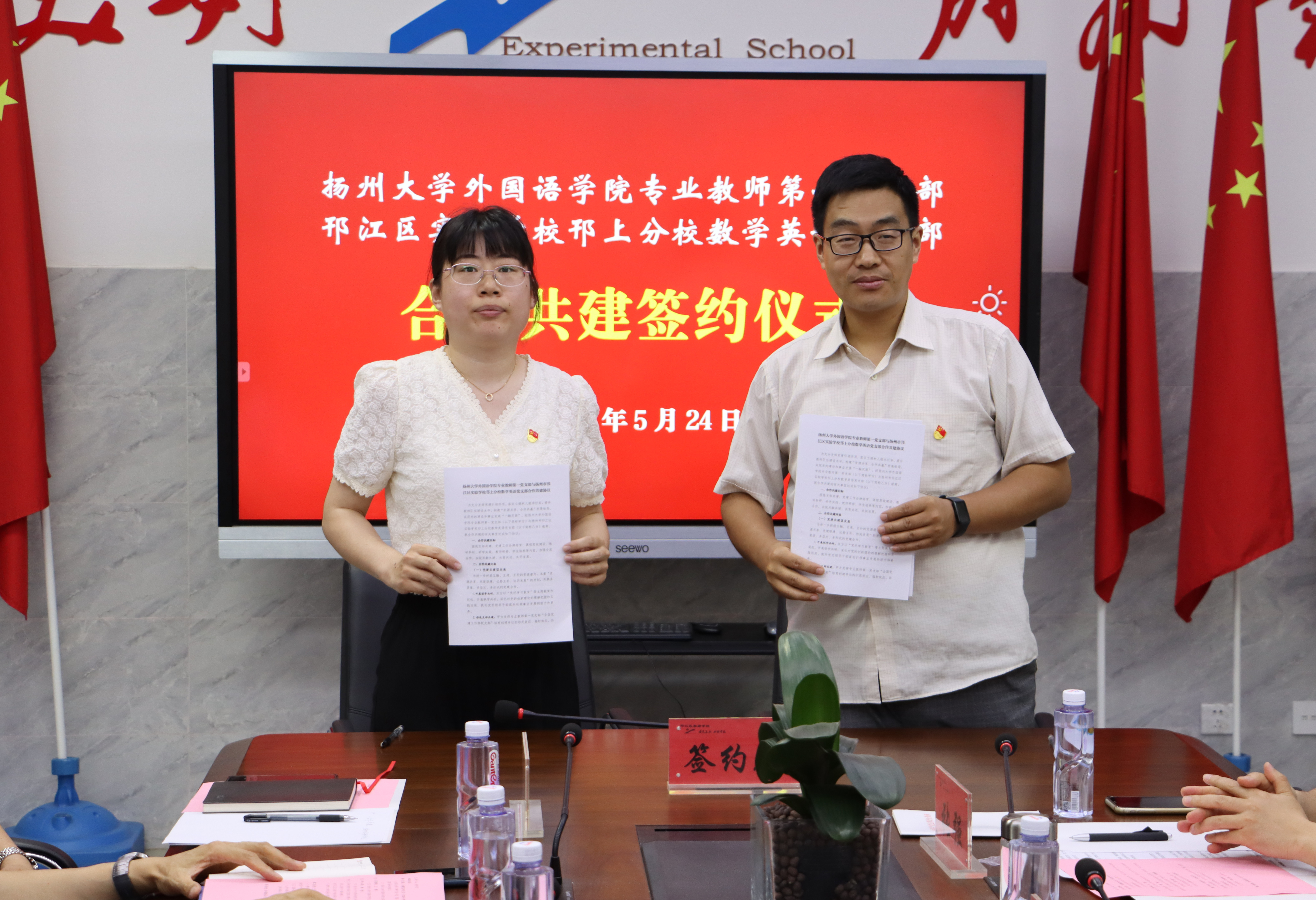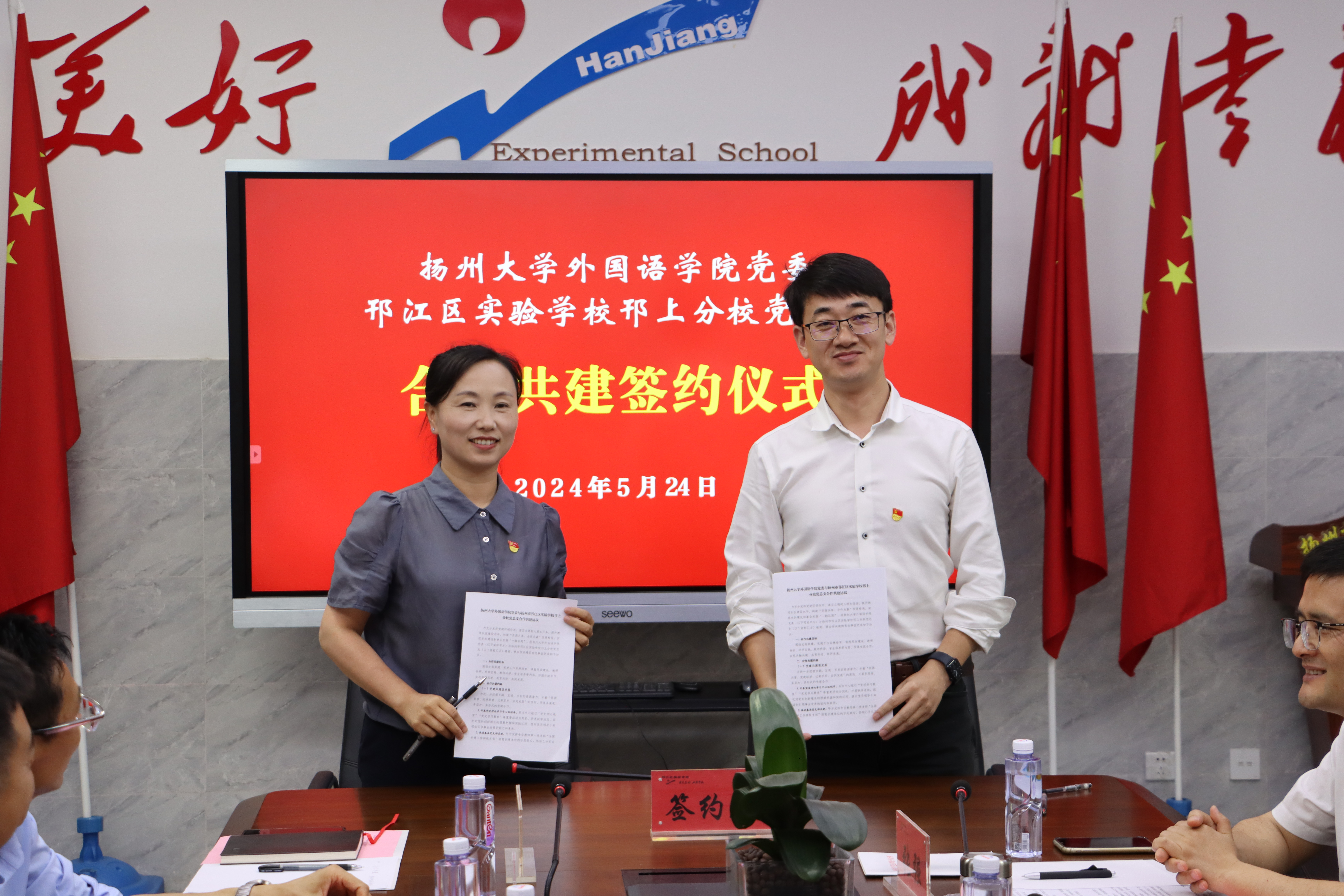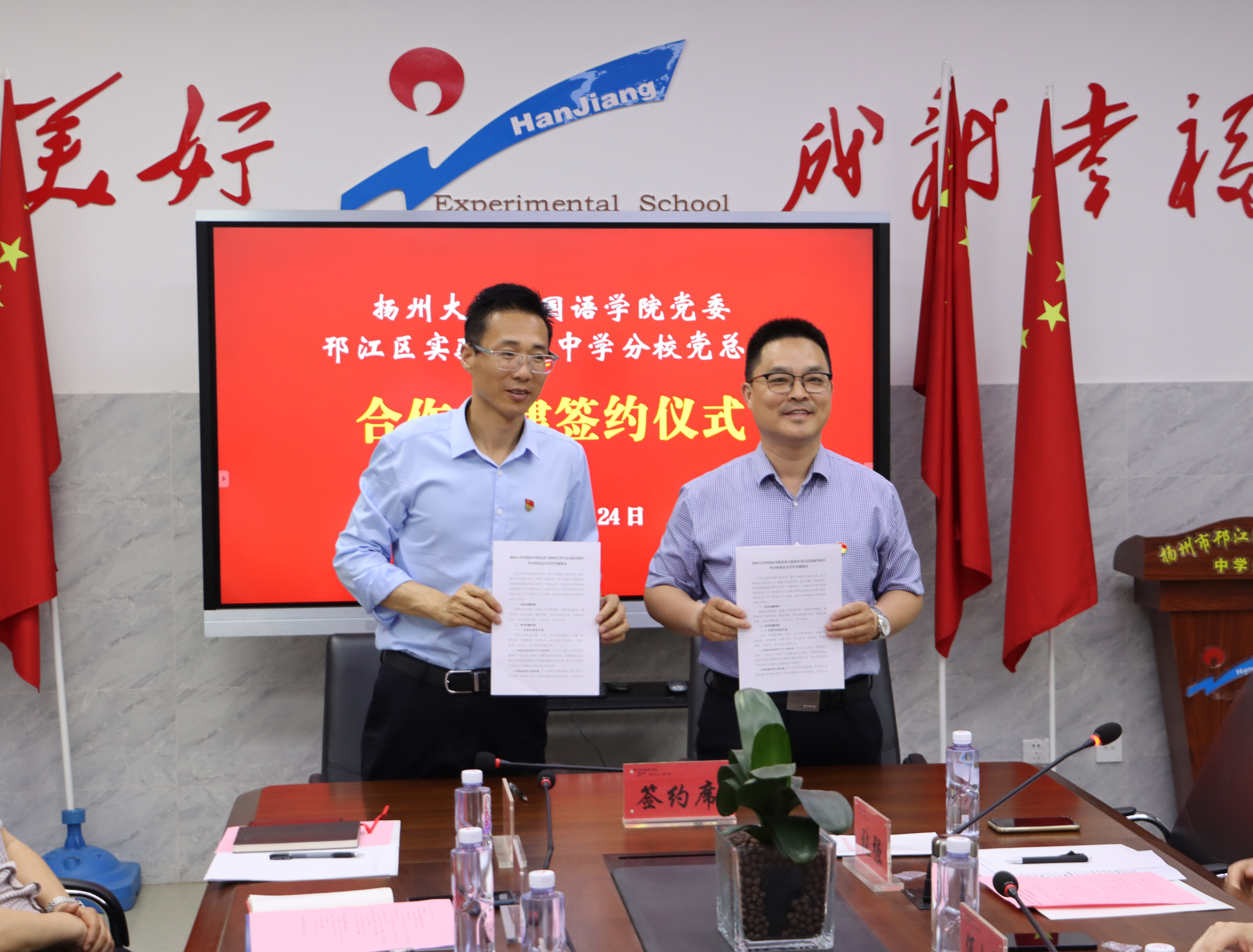 为充分发挥党建引领作用,落实立德树人根本任务,提升教师队伍建设水平,构建“资源共享 合作共赢”的发展格局,推进党建和事业发展“一融双高”。5月24日,我院与邗江区实验学校共建签约仪式在邗江区实验学校中学分校东一楼会议室举行。扬州大学教务处副处长俞福丽、邗江区实验学校校长、党委书记葛光、中学分校校长茅云飞、党总支书记江勇、邗上分校校长蒋燕、党总支书记杨艳、邗江区实验学校副校长王开健、我院院长何山华、副院长丁晓丽、张强出席仪式,院党委书记居学明主持会议。