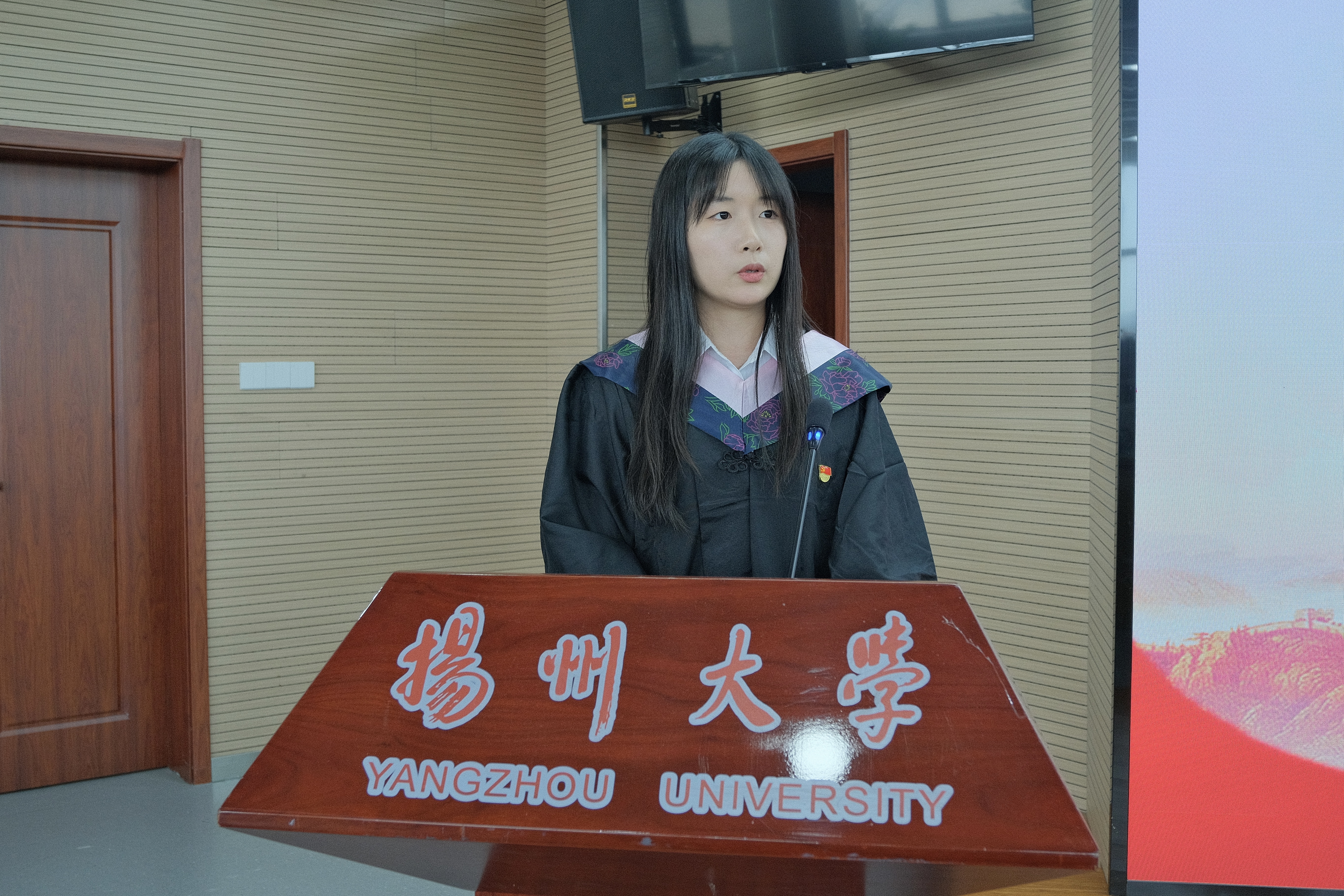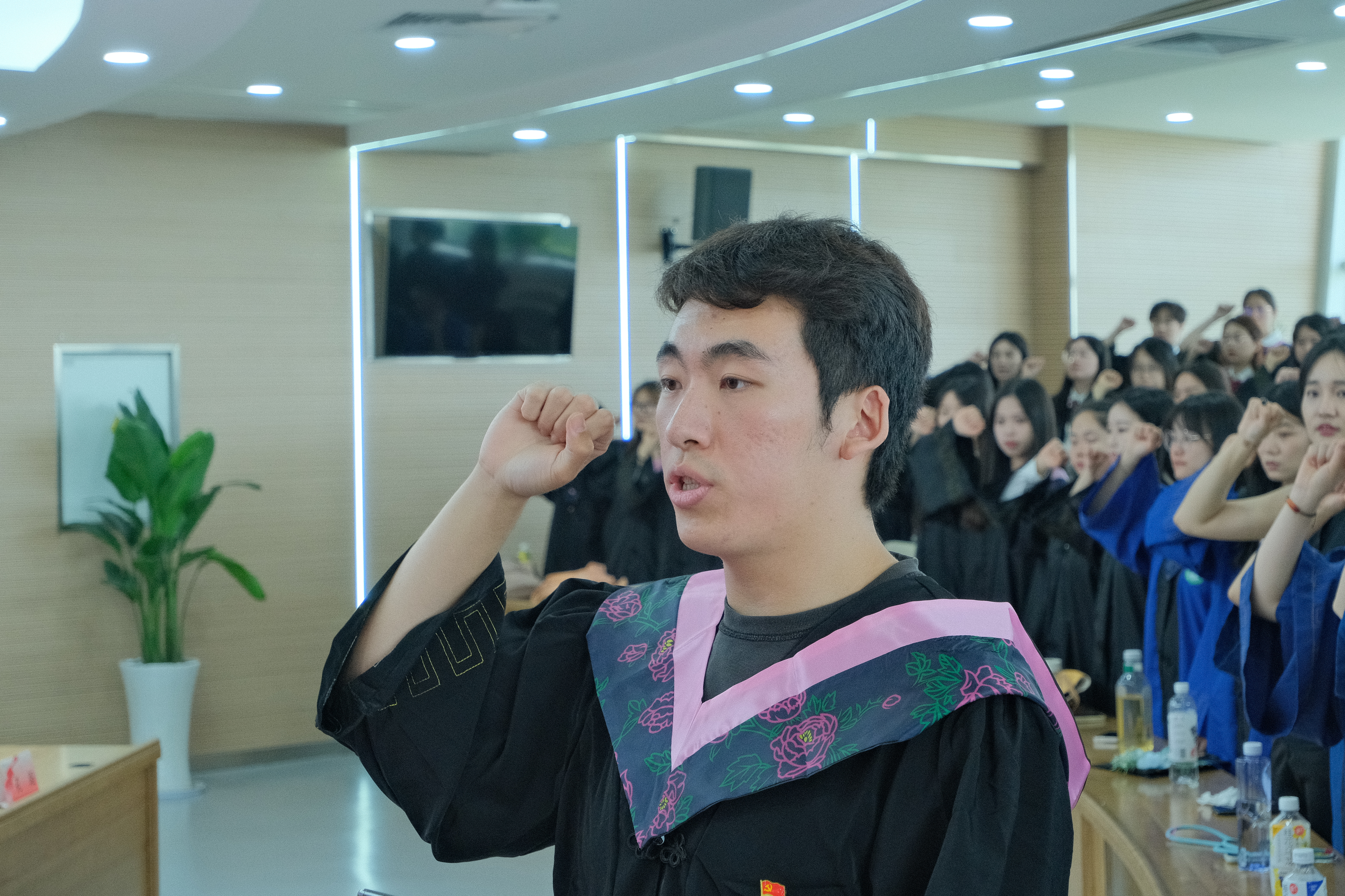 伴随着铿锵有力的宣誓声,仪式正式开始,本科生第二党支部党员王梓任同学带领全体毕业生党员重温入党誓词,重忆入党初心。