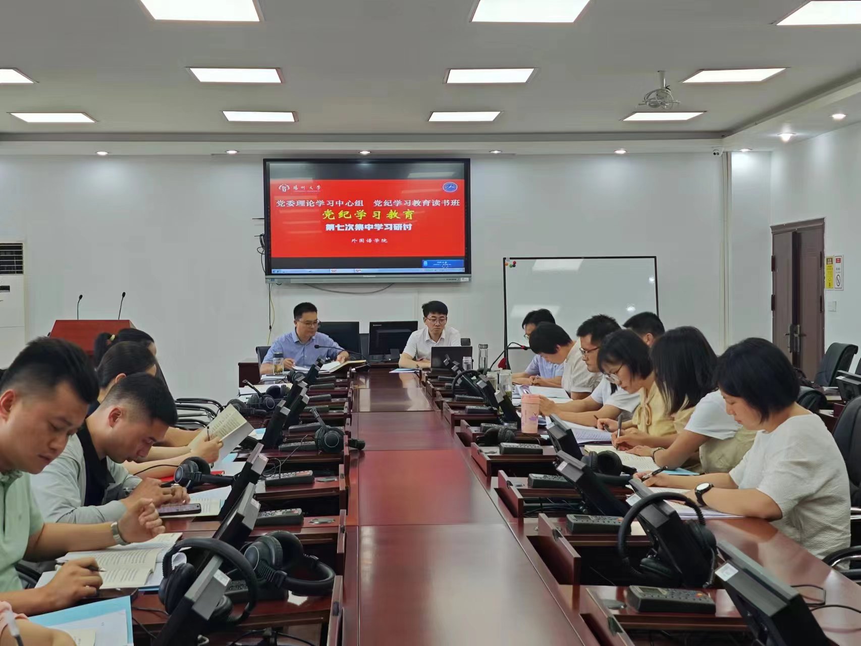 6月17日,我院党纪学习教育专题读书班全体成员在笃行楼二楼同传实验室开展第七次集中学习研讨,院党委书记居学明主持会议。