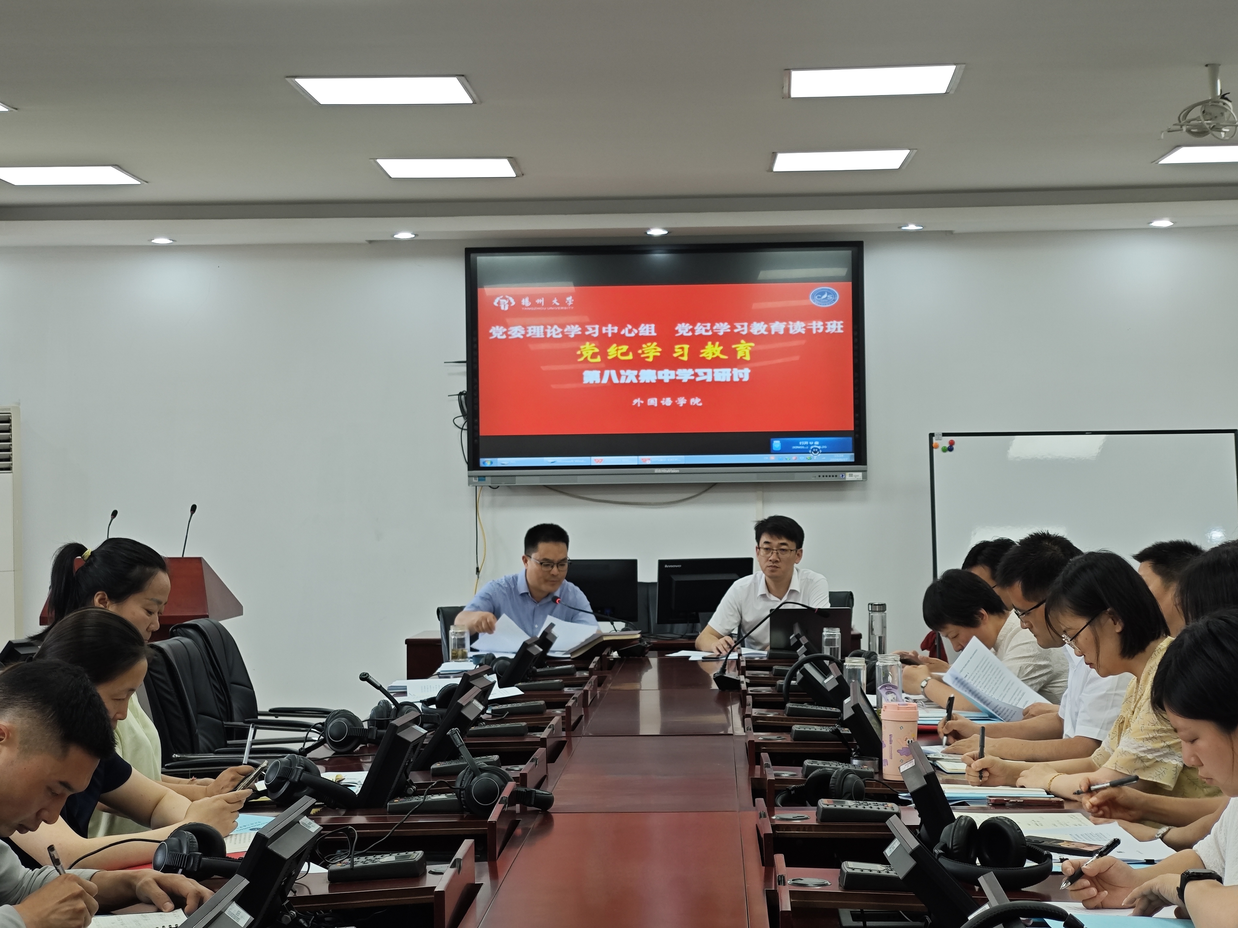 6月24日,我院党纪学习教育专题读书班全体成员在笃行楼二楼同传实验室开展第八次集中学习研讨,院党委书记居学明主持会议。