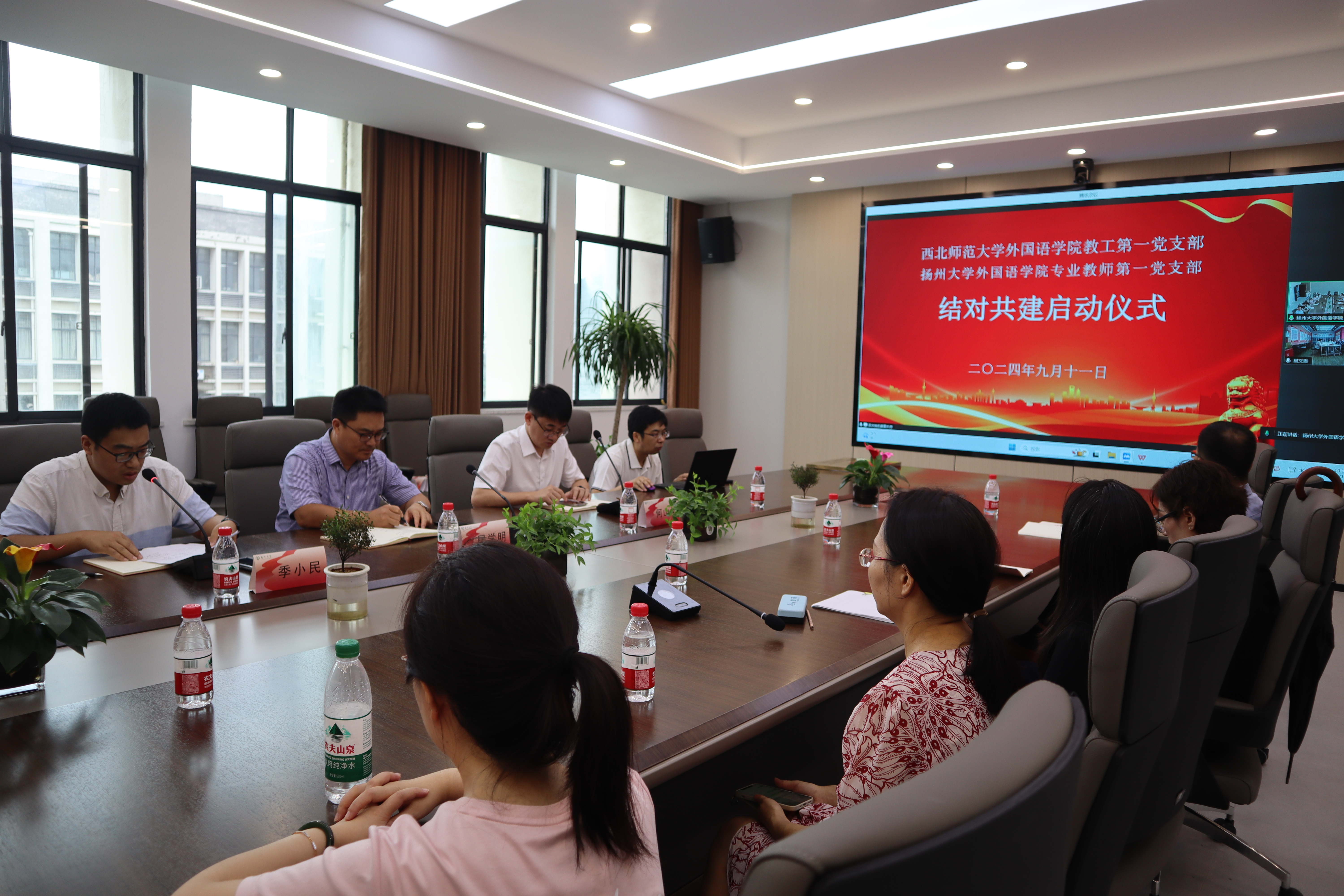 2024年9月11日,我院专业教师第一党支部与西北师范大学外国语学院教工第一党支部结对共建启动仪式通过线上举行。西北师范大学外国语学院党委书记王景、院长高育松、副书记安燕、党委组织员孙娟玲、教工第一党支部书记吕文澎,扬州大学外国语学院党委书记居学明、院长何山华、办公室副主任(党务岗)刘语颂、专业教师第一党支部书记季小民,以及支部委员、党员代表参加会议。会议由吕文澎和季小民共同主持。