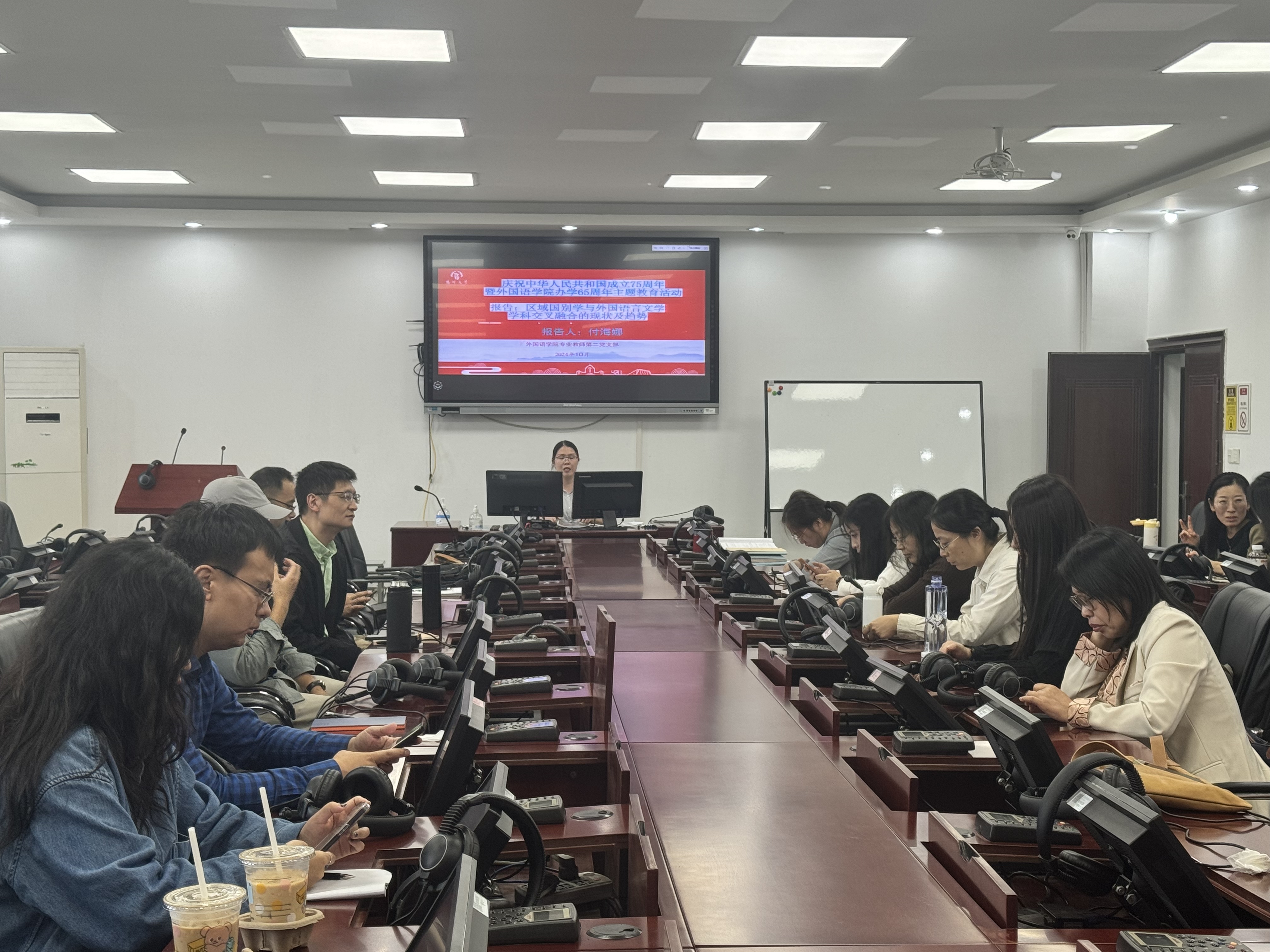 10月9日,专业教师第二党支部举办了“立德树人守初心 踔厉奋发做真人——庆祝新中国成立75周年暨外国语学院办学65周年”主题党日活动。院长何山华详细解读了《中共中央国务院关于弘扬教育家精神加强新时代高素质专业化教师队伍建设的意见》,围绕“把握新时代脉搏 筑梦教育强国”“弘扬教育家精神 潜心立德树人”“聚焦‘双一流’建设 挺膺担当作为”三个部分,开展师风师德教育,他表示,应将“爱国情怀、民族精神、改革创新、世界眼光”融入我们工作生活的点点滴滴,坚持教育家精神弘扬践行,贯穿教师课堂教学、科学研究、社会实践等各环节,筑牢教育家精神践行主阵地。支委付海娜老师做了题为“区域国别学与外国语言文学学科交叉融合的现状及趋势”的专题讲座,详细讲述了区域国别学如何与外国语言文学学科交叉融合,拓展了支部全体非通用语种教师未来研究思路。