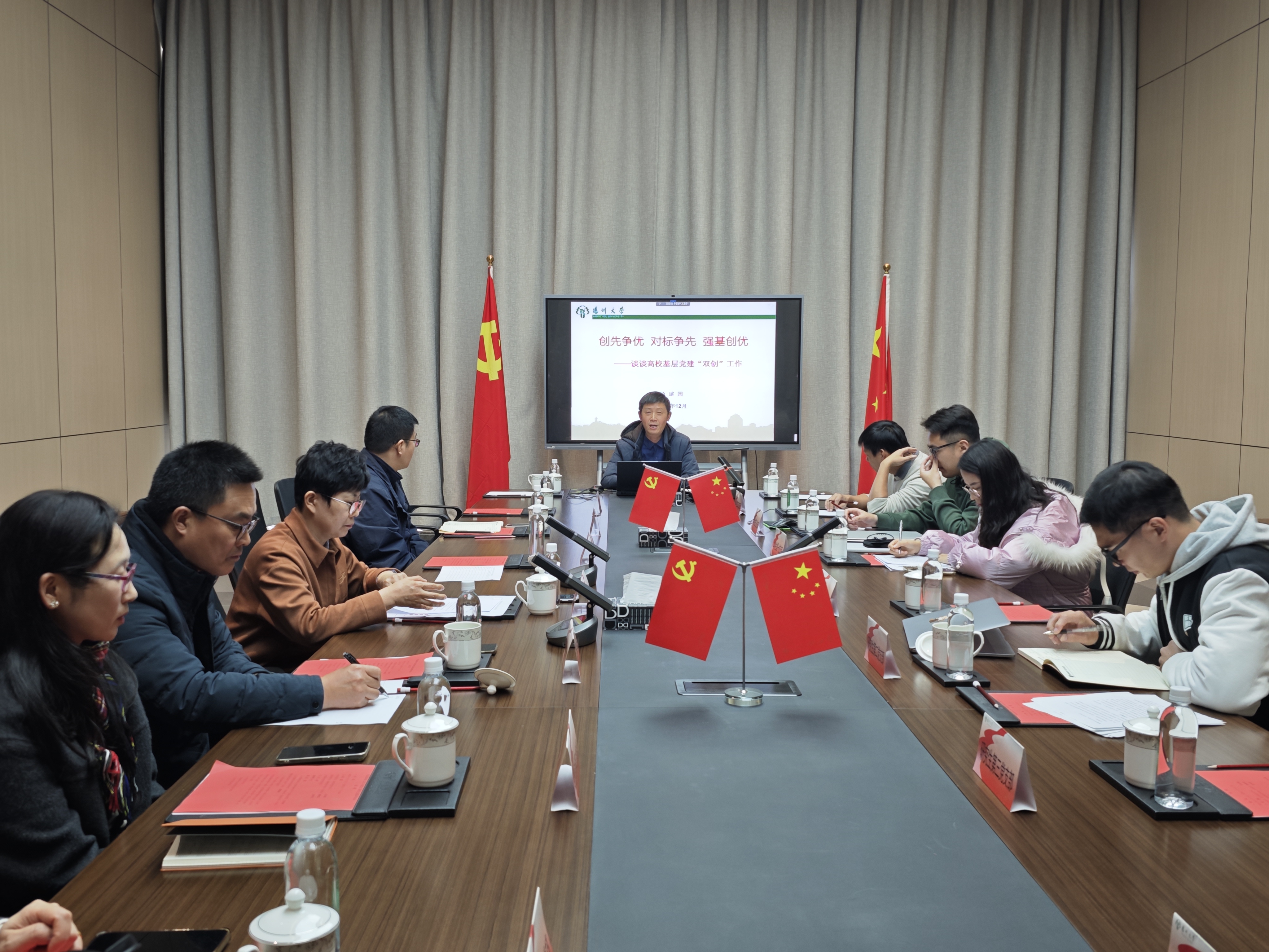 培训会上,顾建国以“创先争优对标争先强基创优——谈谈高校基层党建‘双创’工作”为主题,从政策背景、核心内涵、实践路径等方面展开深入解读。他系统梳理了《中国共产党普通高等学校基层组织工作条例》等相关政策法规体系,明确“双创”工作即“示范创建和质量创优”,是推动高校党建质量全面提升的重要抓手。顾教授详细阐述了创先争优活动、“对标争先”建设计划、“强基创优”建设计划及“提质增效”三年行动计划的发展脉络与核心要求,重点解读了先进基层党组织“五个好”、优秀共产党员“五带头”、校党委“四个过硬”、院系党组织“五个到位”、基层党支部“七个有力”等关键建设标准。同时,他结合江苏高校党支部建设“111计划”等实践案例,对“双创”工作的建设周期、方法步骤及考核要求进行了具体说明,强调要通过“遴选-培育-达标”的示范引领体系,推动基层党建全面过硬。