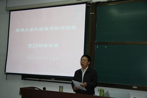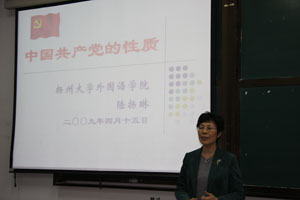 4月15日下午,外国语学院党校第二十九期培训班在中心校区教学主楼W136开班,院党委副书记陈俊老师对学员提出了学习要求,院党委书记陆扬琳老师进行了“党的性质”的第一讲讲座。讲座中,陆书记联系深入学习实践科学发展观的活动和当前学校安全工作,对91名入党积极分子提出了具体的学习要求,她希望同学们要把此次党校培训和平时的学习、工作、生活与深入学习实践科学发展观活动有机结合起来。