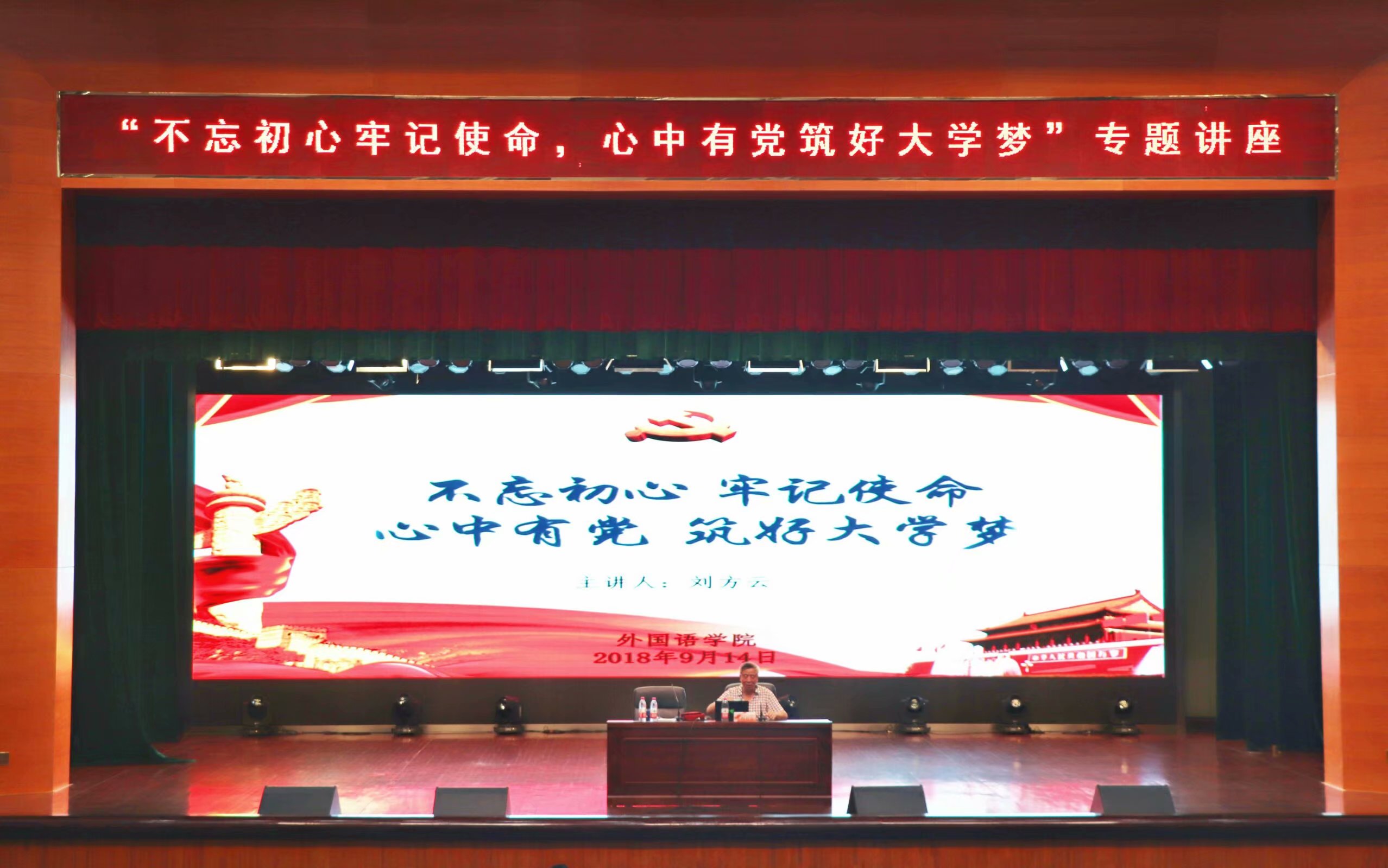 9月14日晚,外国语学院在文体馆举行第59期初级党校培训班,特邀校工委刘方云主任做“不忘初心牢记使命,心中有党筑好大学梦”专题讲座。院党委副书记崔益军、院团委书记刘芳玮出席,全体辅导员及18级本科生、研究生参加。