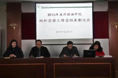 3月17日下午4点,2016年度外国语学院对外宣传工作总结表彰大会在笃行楼报告厅举行。此次大会受到学院领导的高度重视,特邀校宣传部副部长吴锡平老师出席,院党委书记刘胜乐、副书记崔益军、团委书记刘芳玮及其他老师都参加活动。