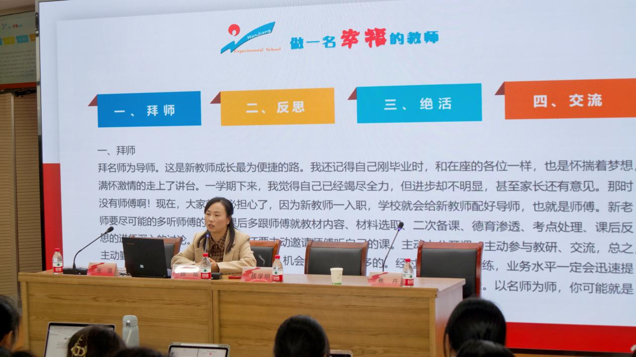 杨艳表示,初入职场,要修炼好“拜师、反思、绝活、交流”等本领。一要拜名师为导师,修身手,虚心请教资深教师;二要勤于反思,修眼力,将集体反思与个体反思想结合,提升自我;三是要练就个人绝活,修公力,激发学生学习兴趣;四是要善于沟通交流,修情感,放下架子,俯下身子,真正了解学生的心理动态和情感需求。