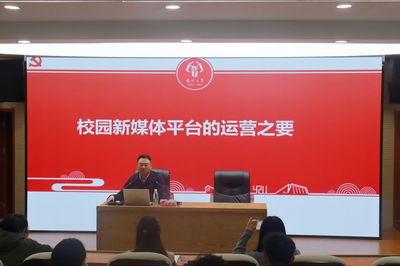 王贵洲以“校园新媒体平台的运营之要”为题,为学生骨干说明了校园新媒体平台是什么、校园新媒体运营的阵地意识和舞台意识、如何提升校园新媒体的影响力。他具体阐释了校园新媒体平台的宣传阵地,着重强调了独家性、重大性以及突发性。最后,王老师强调要将新闻的质量和内涵相结合,不断创新,将校园新媒体舞台之路走得更好更远。