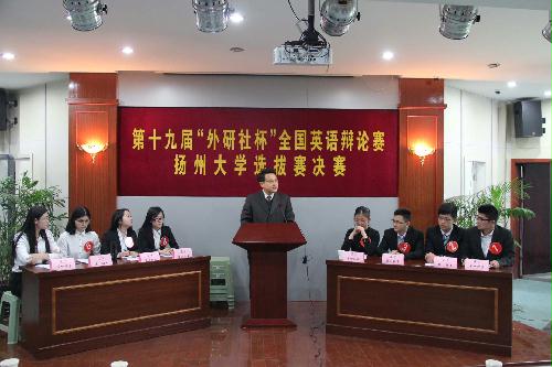 “宏辞论道、纵横天下”,3月30日,由扬州大学团委主办、我院承办的第十九届“外研社杯”全国大学生英语辩论赛校内选拔赛决赛在我院N402报告厅举办。校学生处处长张信华,校团委书记徐蕾,院党委书记刘胜乐,院长秦旭等全体院领导出席了此次比赛。