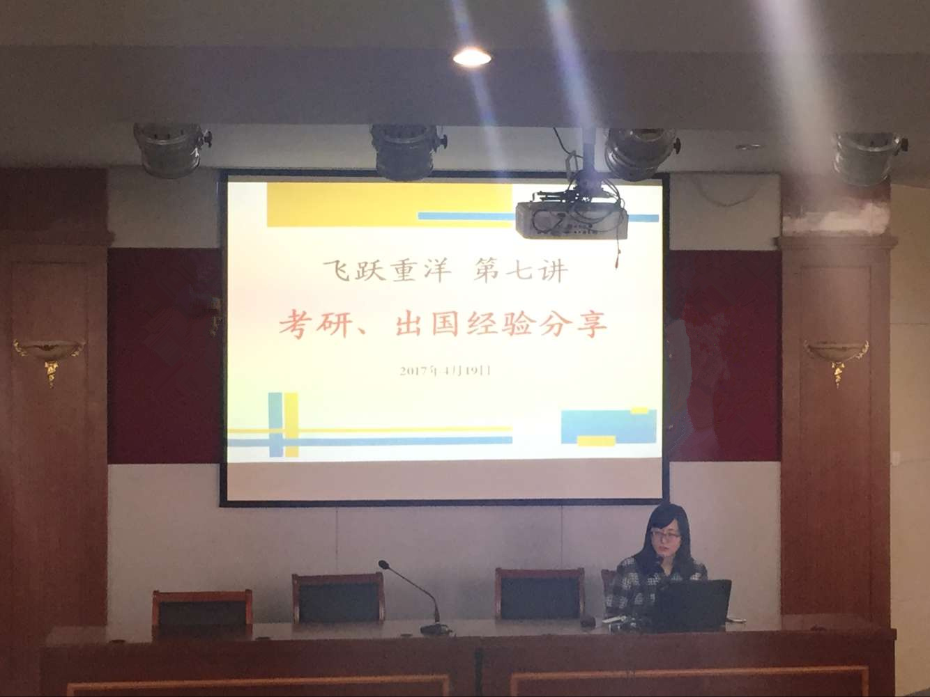 4月19日下午4点,飞跃重洋系列讲座第七讲在笃行楼四楼报告厅拉开帷幕。本次讲堂邀请到了部分考研成功、顺利拿到国外大学offer的学霸们,针对备考、出国留学的准备等一系列问题与同学们开展了交流。