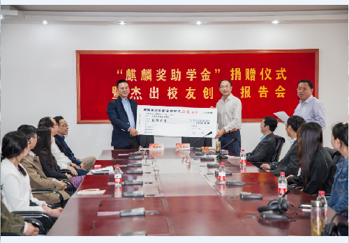5月5日下午,扬州大学外国语学院在笃行楼会议室召开“麒麟奖助学金捐赠仪式”暨杰出校友创业报告会。学院杰出校友薛麒麟先生与到场的本科生、研究生代表分享了自己的创业经验;为感恩母院对他的培养,同时激励外院学子奋发向上,努力学习,现场捐赠了“麒麟奖助学金”。扬州大学对外联络办公室主任、校友总会秘书长王庆林,校研究生院常务副院长俞洪亮,校行政党总支书记、国际交流与合作处副处长张吟,外国语学院党委书记刘胜乐,院长王金铨,党委副书记崔益军,副院长于建华、缪海涛等各位领导出席本次仪式。