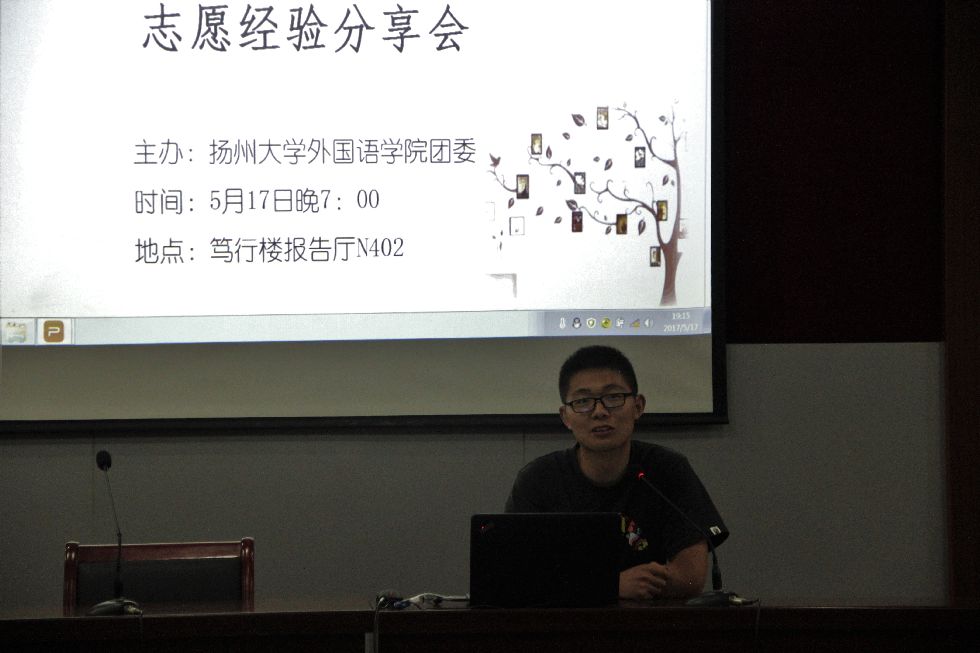 5月17日晚,扬州大学外国语学院团委在笃行楼四楼报告厅举行了“译马当先”志愿经历、经验交流分享会。来自团队的三位优秀志愿者代表,分享了一些自己在志愿者服务方面的心得与感悟。