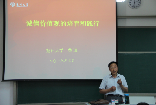 5月18日,扬州大学外国语学院翻译1401班和翻译1402班举行“至诚则成,立信于行”的主题班会活动,探讨诚信价值观。本次活动很荣幸邀请到马克思主义学院费迅教授,首先为大家做题为“诚信价值观的培育和践行”的主题讲座。