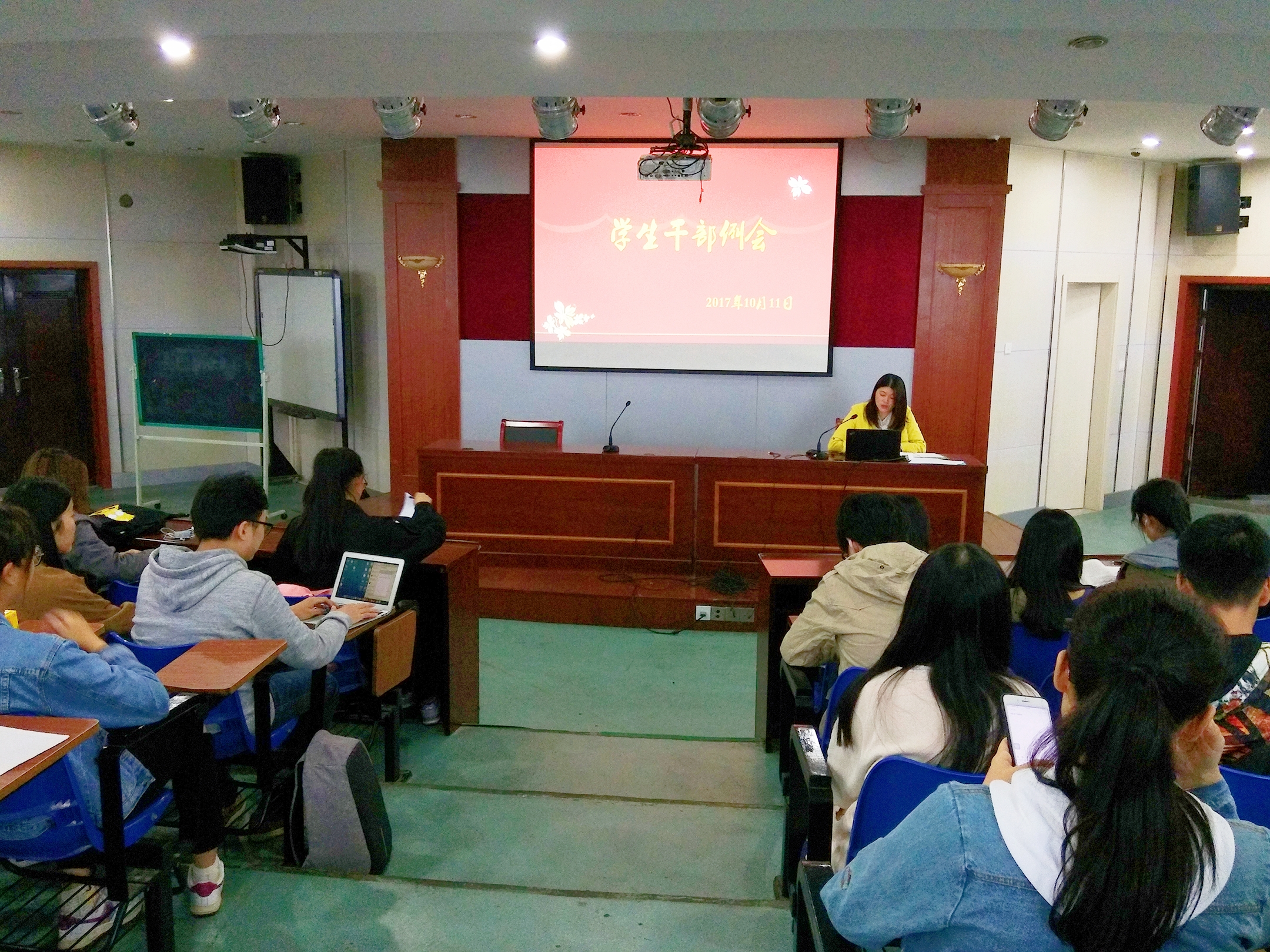 10月11日下午2:30,外国语学院全体学生干部在笃行楼四楼报告厅举行例会,共同探讨班团活动的开展、提高学生工作的效率。会议由院团委书记刘芳玮主持,全体辅导员老师参加。
