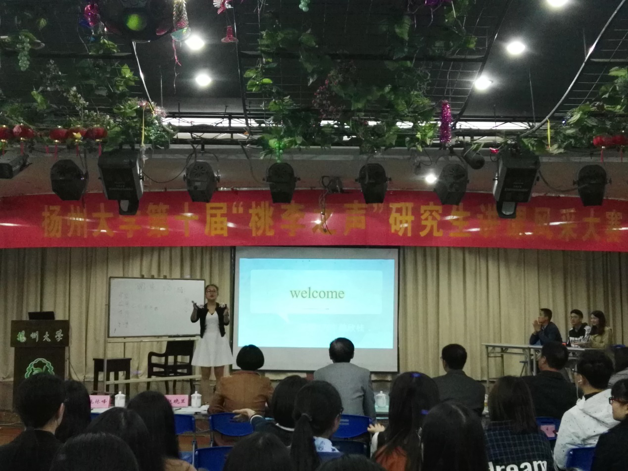 桃李满天下,研子竞风采。扬州大学第十届“桃李之声”研究生讲课风采大赛于10月22日在荷花池中心校区学生活动中心二楼成功举办,我院韩欣桂荣获非师范组一等奖,陈阳阳荣获师范组三等奖。决战告捷,卓尔不群,为我院学子树立了术业专攻、勤学苦练的先进榜样。