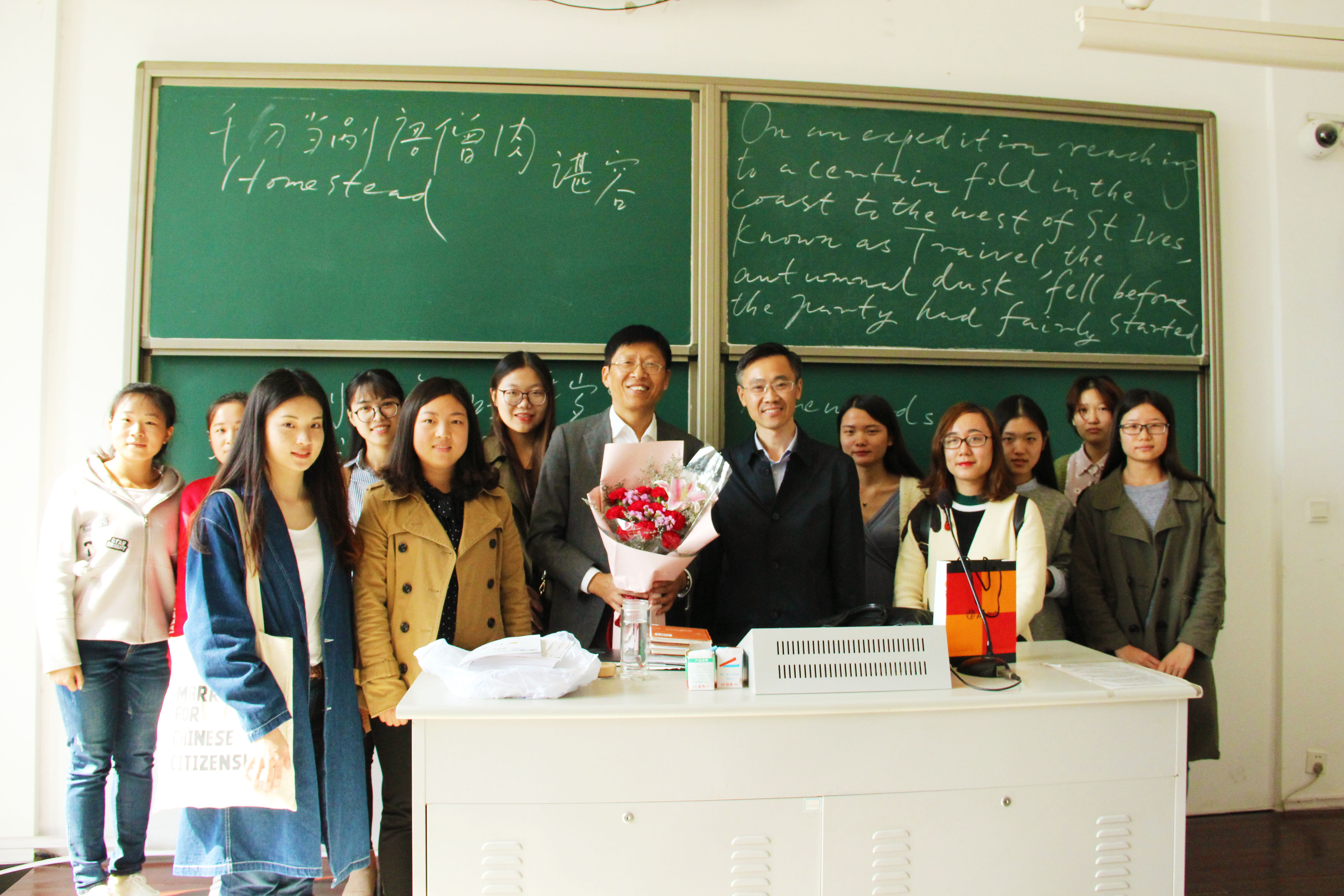 走进教室,师生们亲切交谈,欢声笑语不断,气氛轻松活泼;崔书记一方面慰问朱教授工作生活各方面情况,同时真诚感谢朱教授多年的无私奉献。朱建迅老师作为我院退休老教师,一如既往坚守三尺讲台,三寸粉笔,两袖清风,四季耕耘,一颗丹心一生秉烛献青丝。他挥舞着苍劲有力的笔锋,带着气宇轩昂的气魄,饱含浩瀚渊博的学识,富有镌骨铭心的记忆,授以生动有趣的课堂,外院学子们无一不致以崇高的敬意与满腔的热爱。