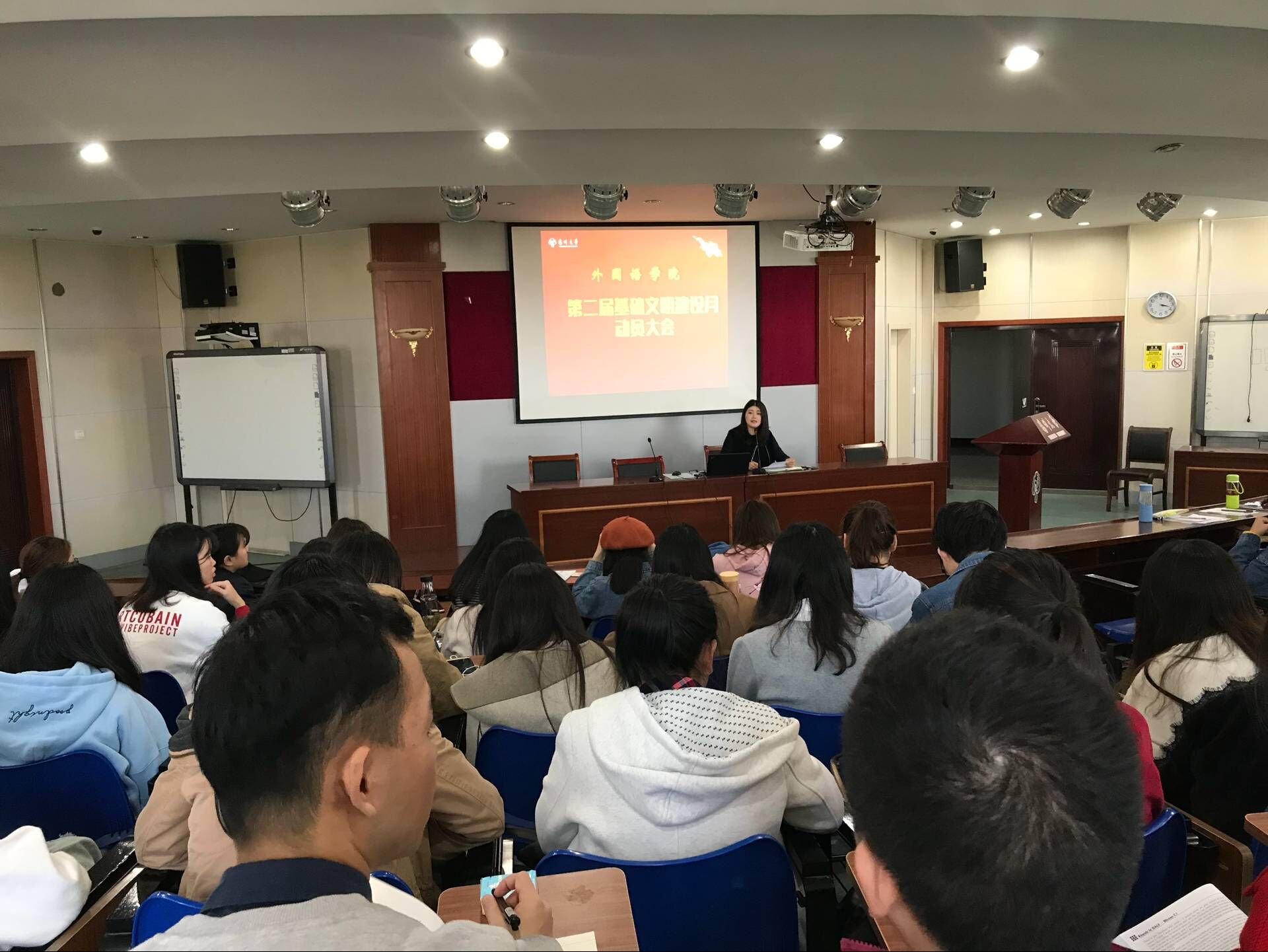 11月1日下午3时,扬州大学外国语学院在笃行楼N402报告厅举办校第二届基础文明建设月动员大会。院团委书记刘芳玮老师、院团委副书记孙月老师、院团委辅导员孔阳老师、院全体学生干部参加会议。