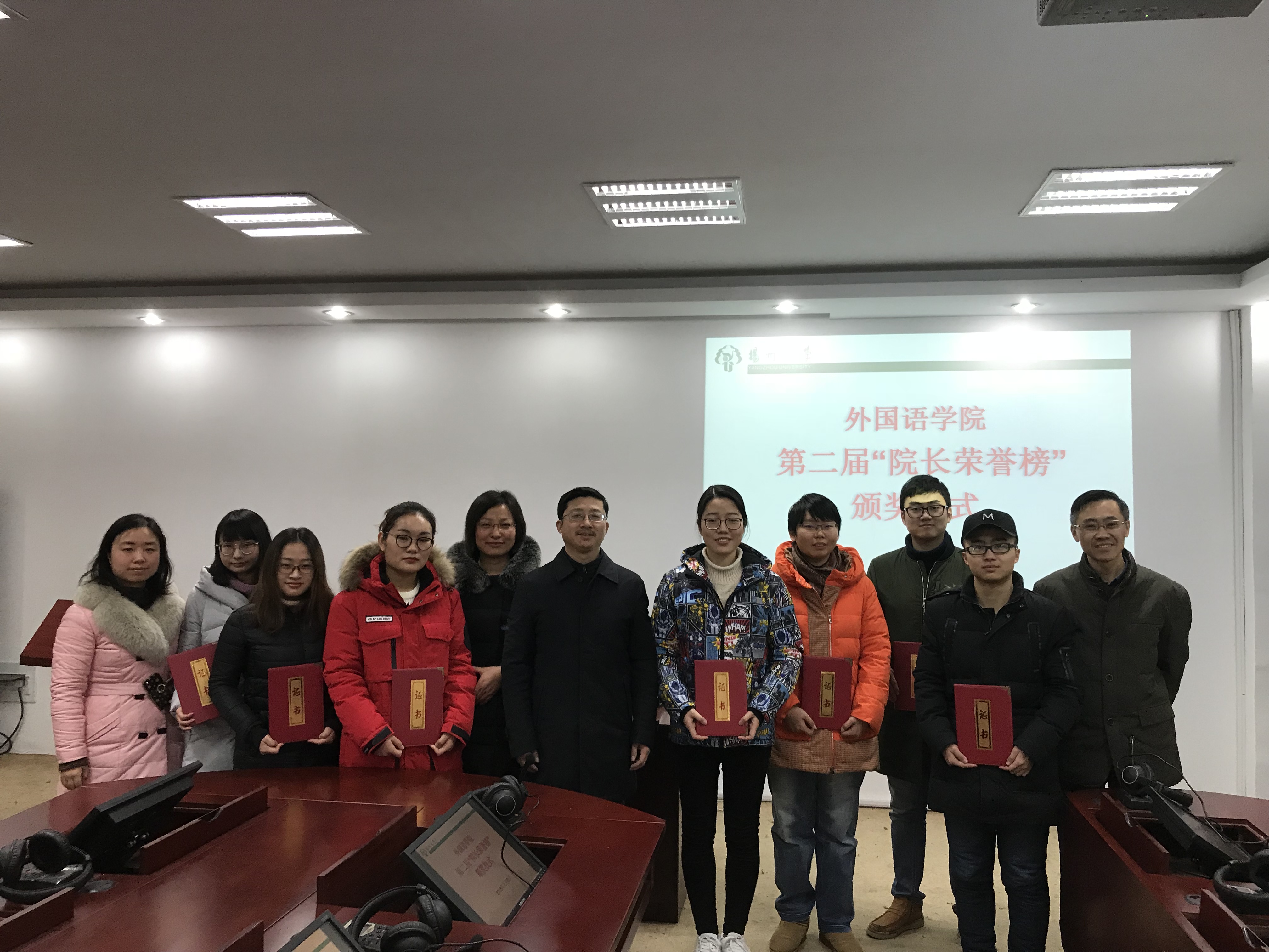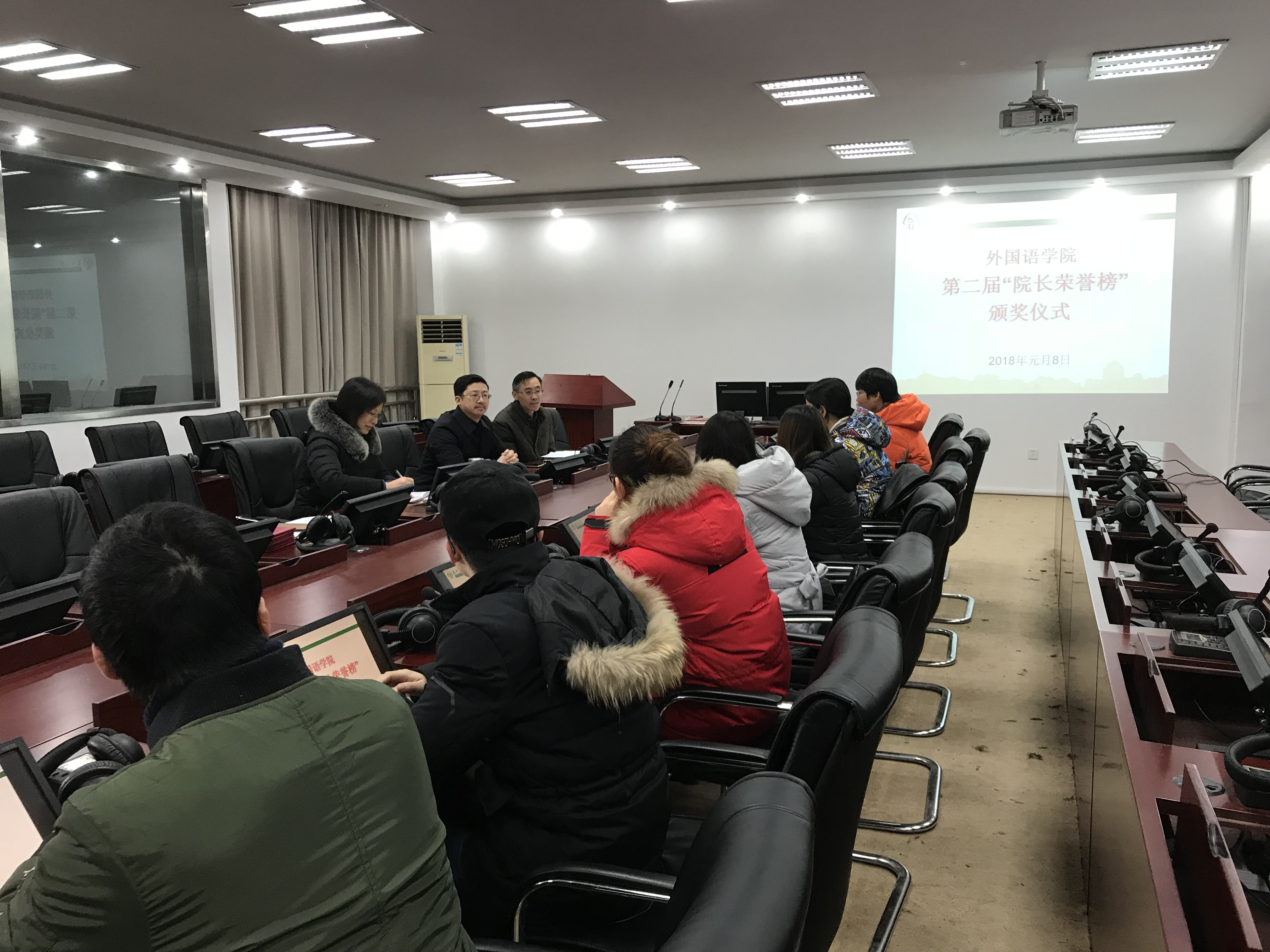 1月8日上午10点,外国语学院第二届“院长荣誉榜”颁奖仪式在笃行楼同声传译室举行。学院王金铨院长、丁晓丽副院长出席,党委副书记崔益军老师主持,研究生教学秘书杨倩老师、团委副书记孙月老师及全体优秀学生代表参加本次会议。