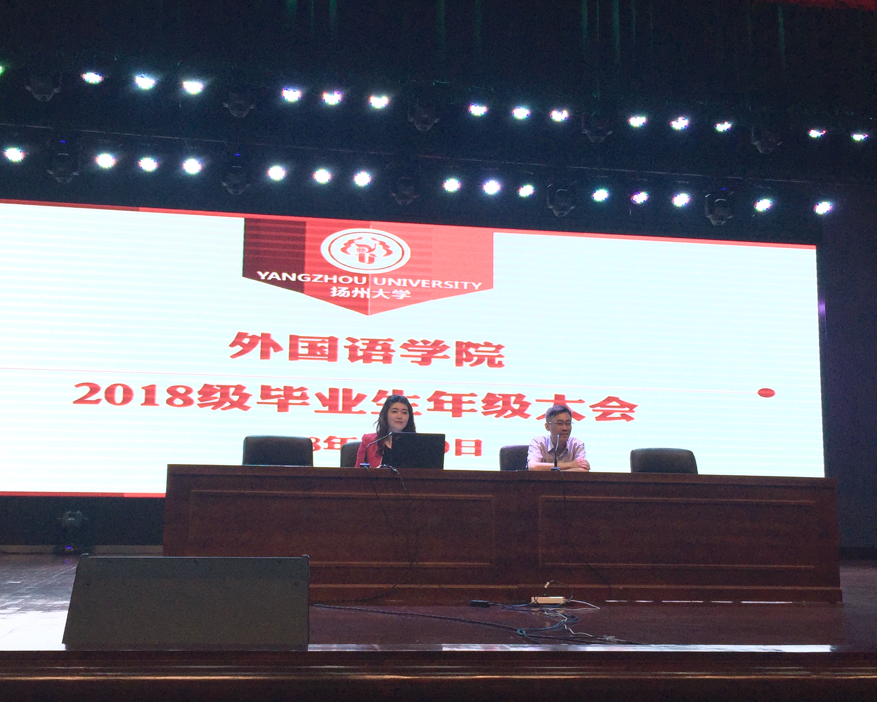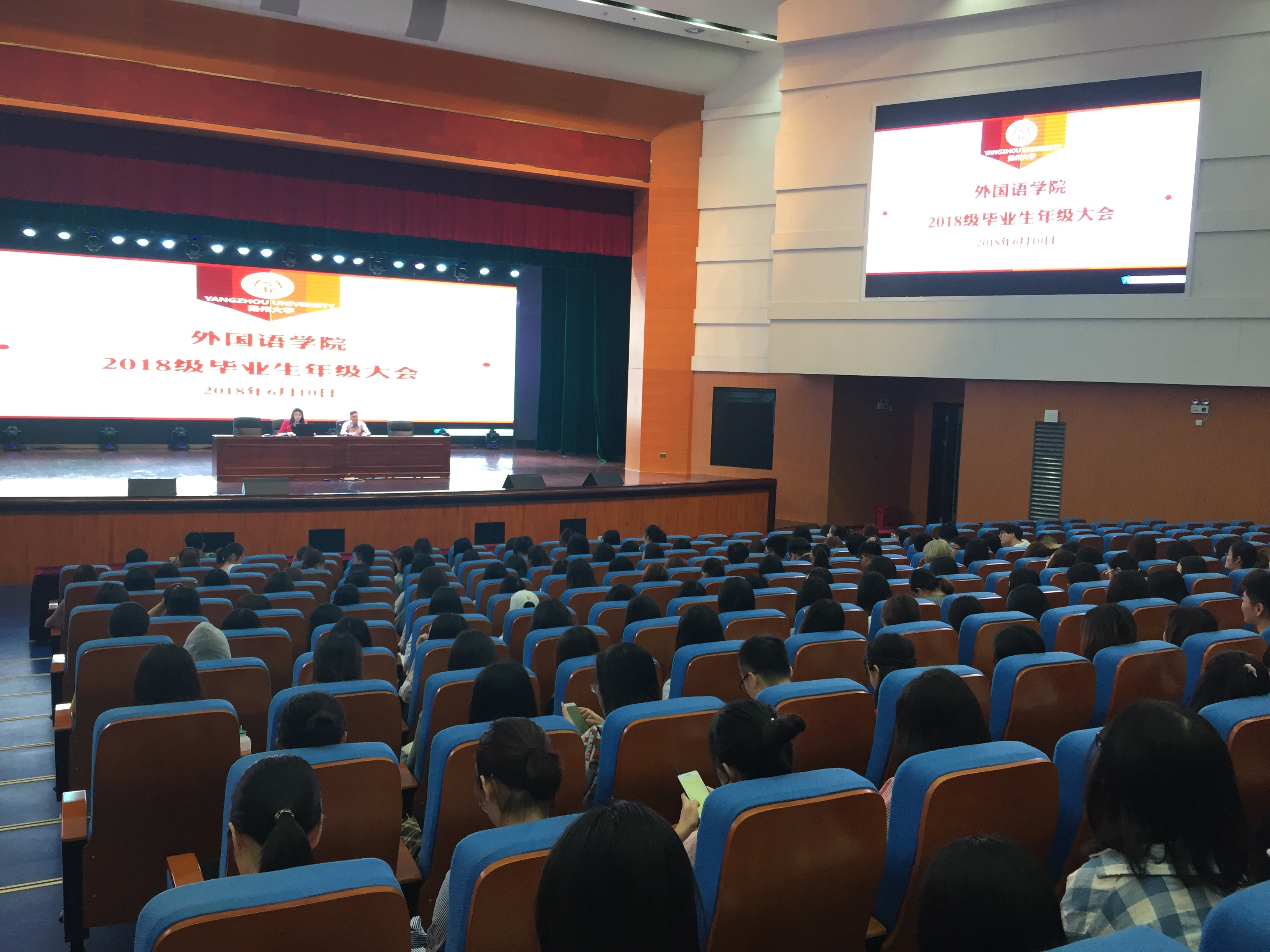 6月10日上午,外国语学院2018届毕业生年级大会在文体馆三楼小剧场召开。会议由院团委书记刘芳玮主持,党委副书记崔益军出席,全体辅导员及14级同学参加。