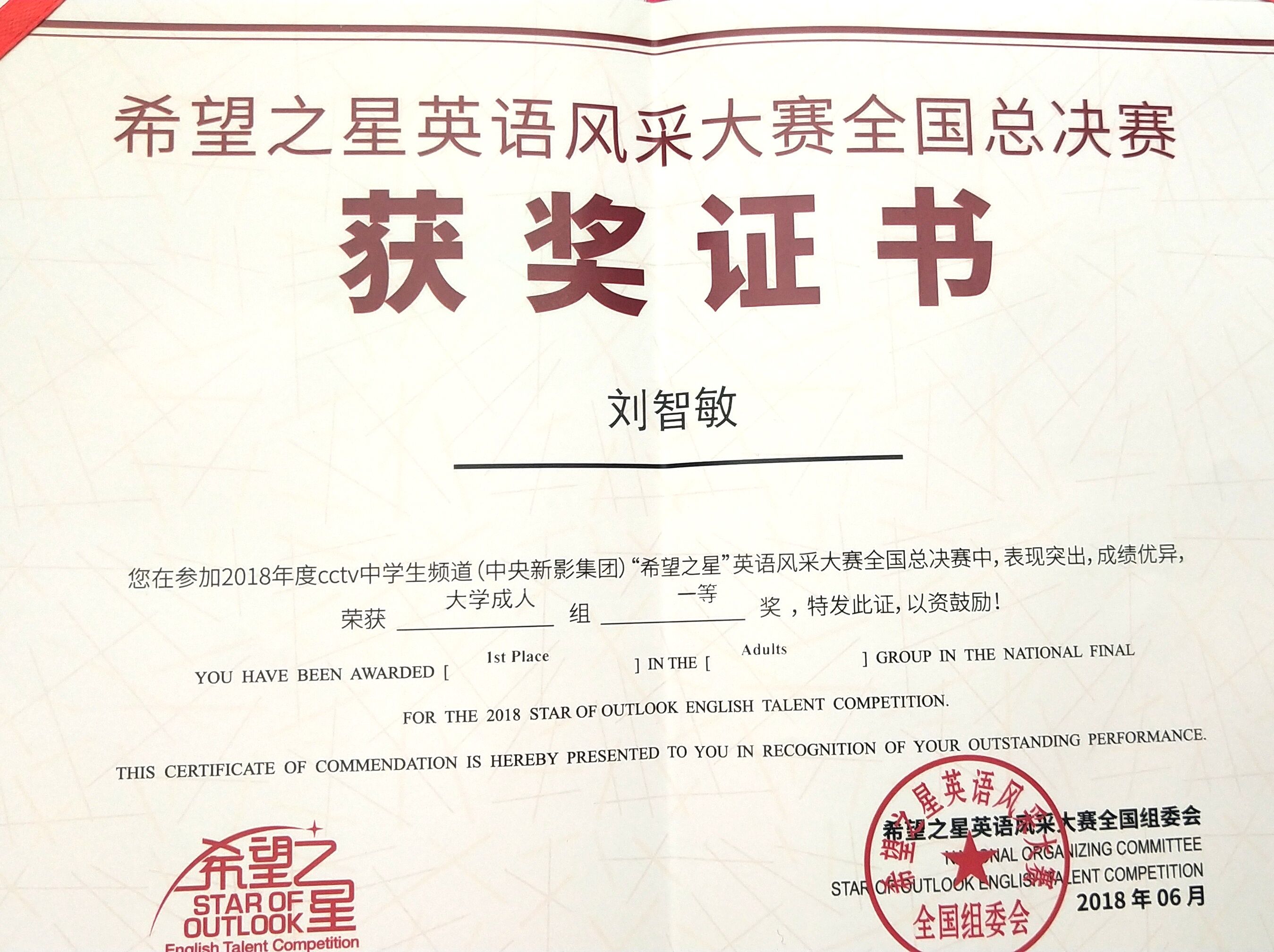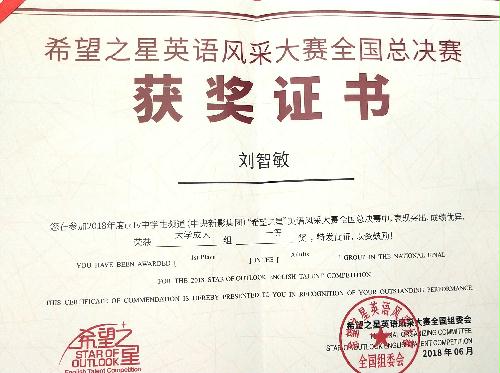 2018年6月10日,CCTV “希望之星”英语风采大赛全国总决赛在北京九华山庄落下帷幕。我院英语专业的刘智敏同学喜获大学组一等奖。