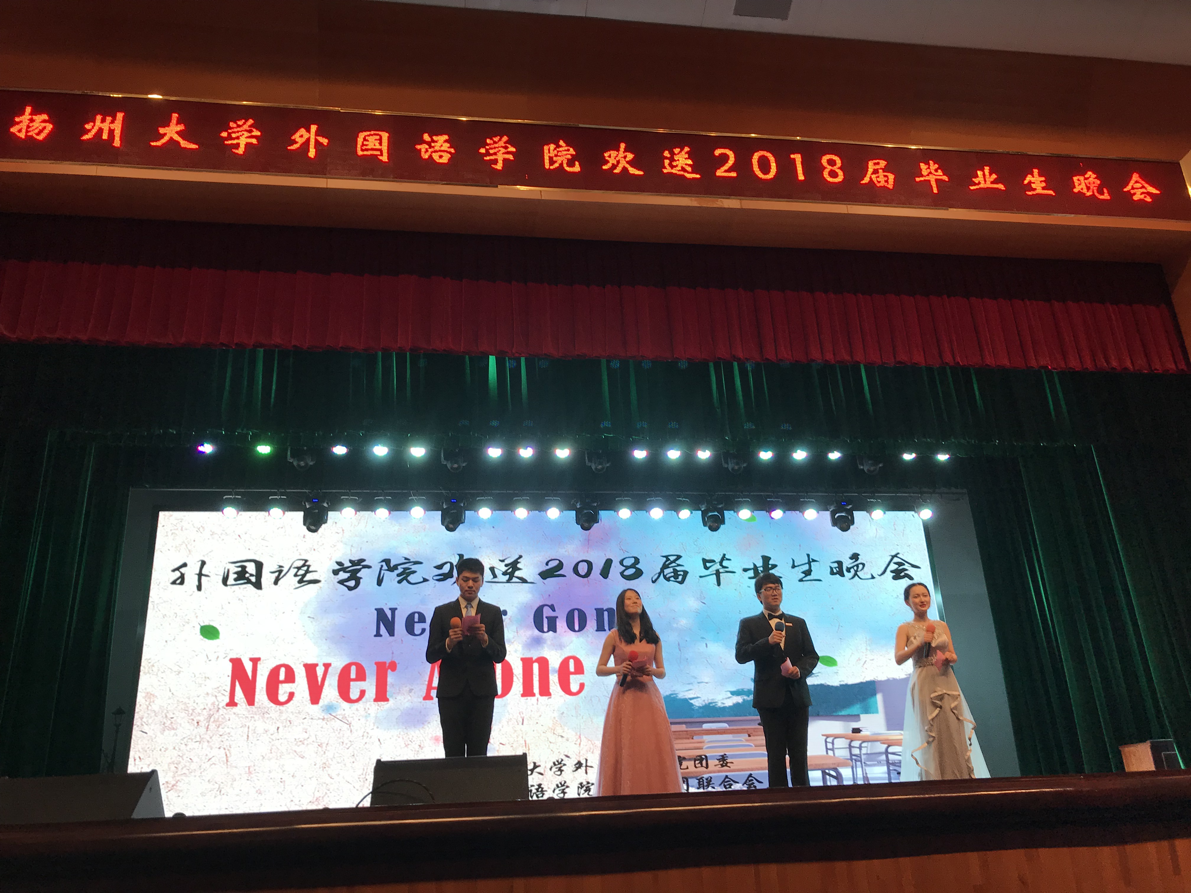 6月10日晚7点,我院在扬子津校区昭文馆举办Never Gone,Never Alone 2018届毕业生晚会。学院党委书记刘胜乐、副书记崔益军出席,院团委学工办老师、班主任、系部主任、全体毕业生及其他年级同学参加,共同见证这场盛大的毕业晚会。