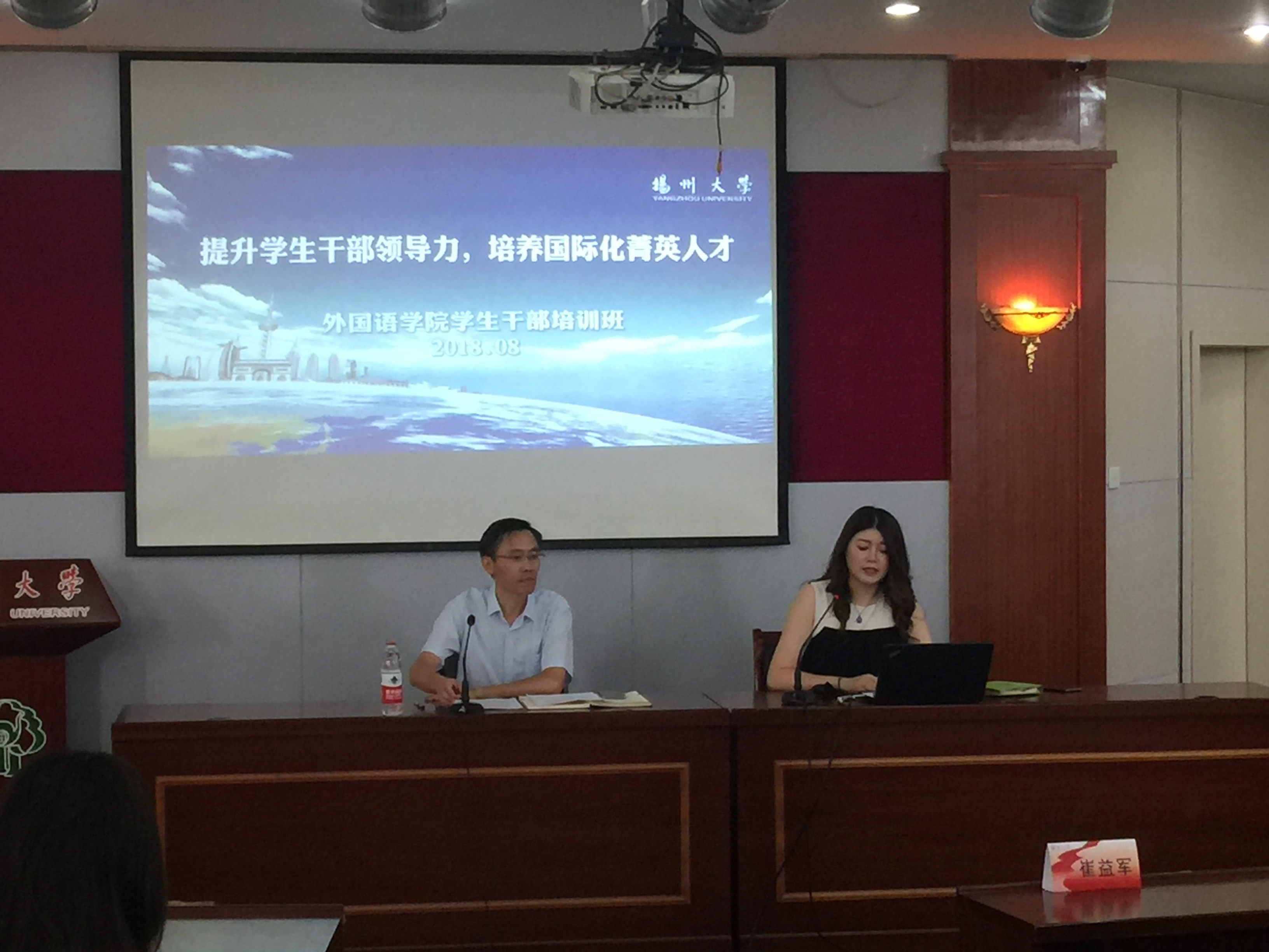8月27-28日,外国语学院“提升学生干部领导能力,培养国际化菁英人才”学生干部培训班在笃行楼报告厅举行。学院团委书记刘芳玮老师主持,院党委副书记崔益军老师出席现场并作动员讲话,学院全体辅导员老师和主要学生干部参加学习。
