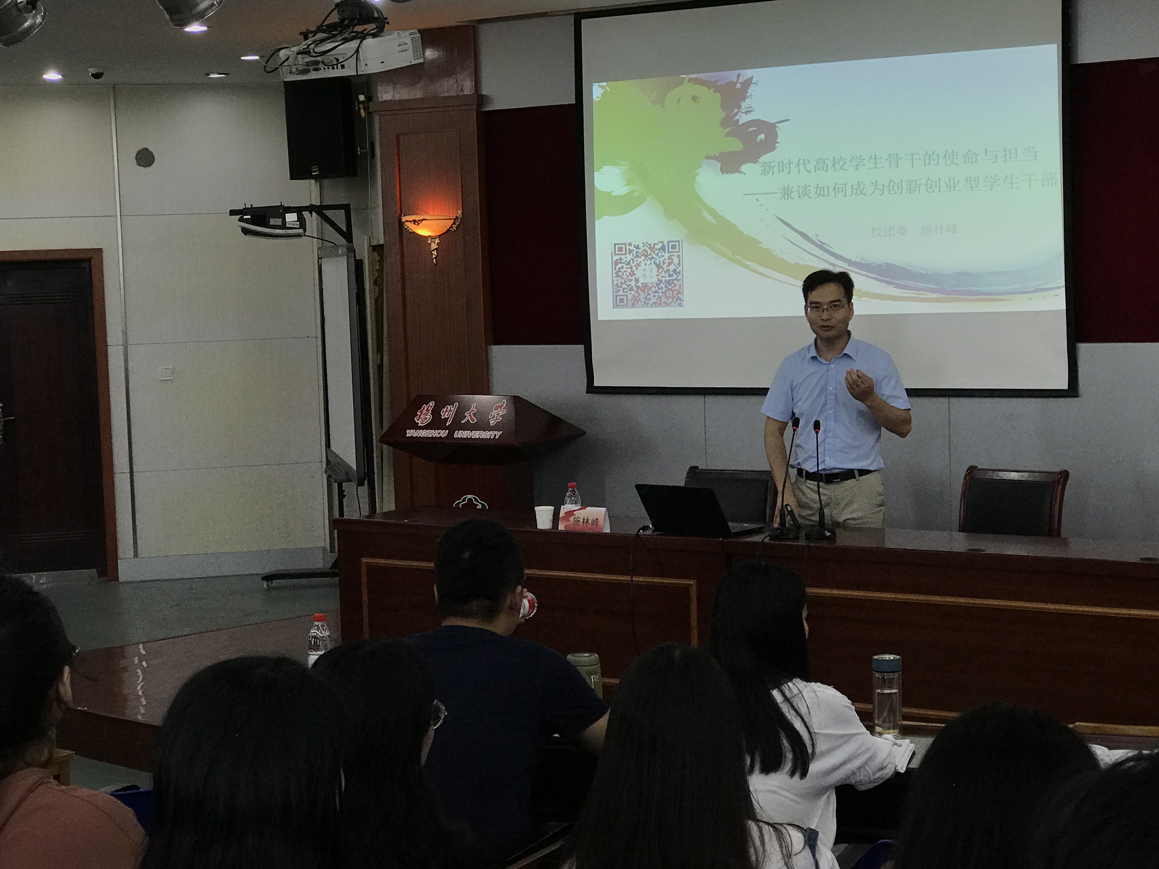 校团委书记施林峰老师为外国语学院主要学生干部做主题为“新时代高校学生骨干的使命与担当”的讲座,兼谈如何成为创新创业型学生干部。施书记指出,学生干部是在组织中的个体,组织赋予了学生干部这一身份,因此学生干部在行使职权时不能脱离群体。如今,我国已逐渐从“中国制造”转向“中国创造”,在新时代创新创业的大趋势下,创新创业是学生干部必须把握的时代潮流。青年一代是创新创业的主力,要借鉴古今中外的经验,纵横交叉,全面学习,努力提高自己的平台,开阔自己的视野。