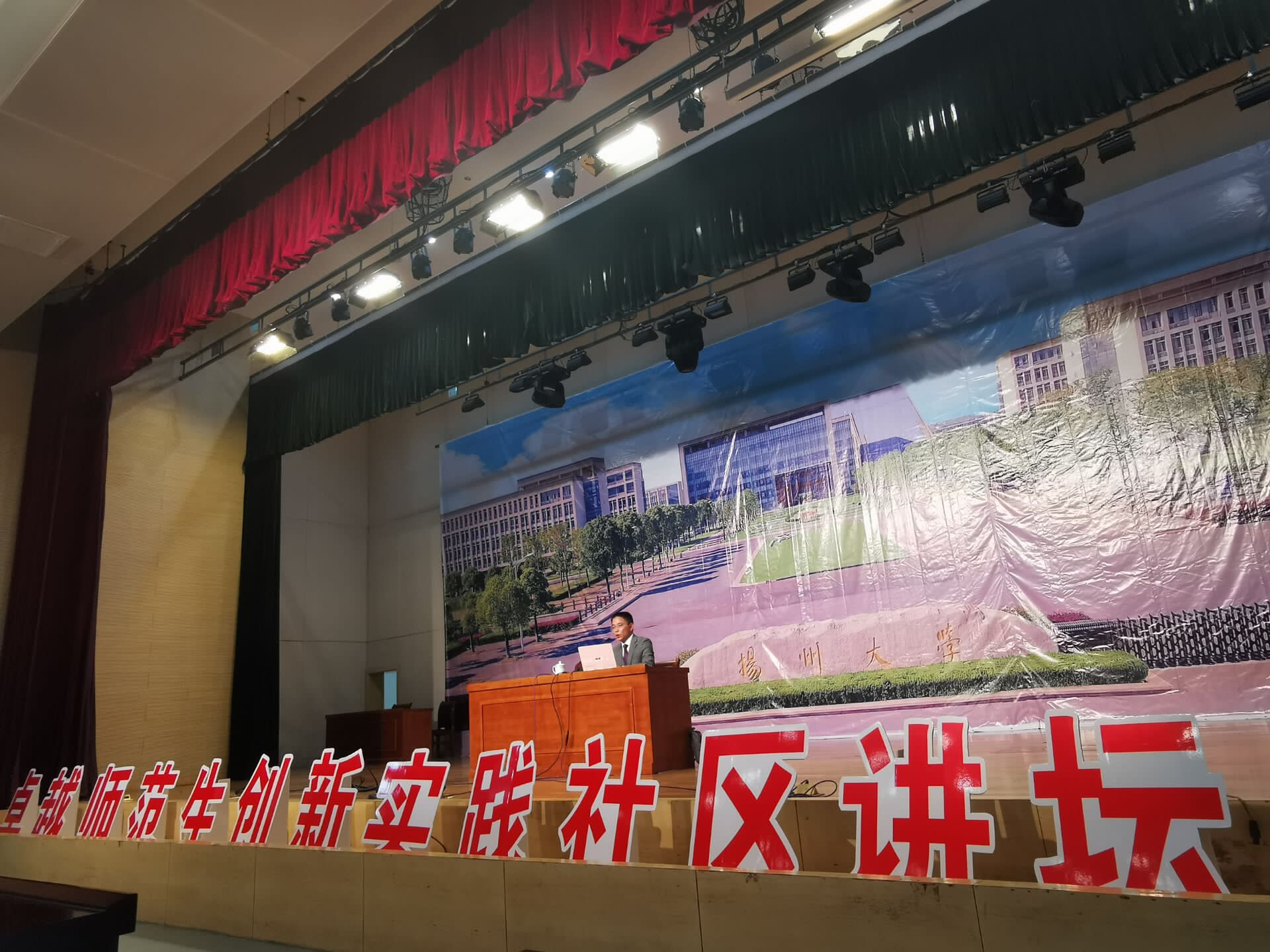 10月23日下午,外国语学院“一院一品”系列活动“卓越师范生创新实践社区讲坛”第四讲在昭文馆报告厅正式开讲。本次讲坛邀请了江苏省教学名师、正高级教师、镇江市名师工作室领衔人夏春来为大家主讲,活动由英语教育系主任陶竹主持,英语(师范)专业2017和2018级全体师范生约300余人参加了本次讲座。