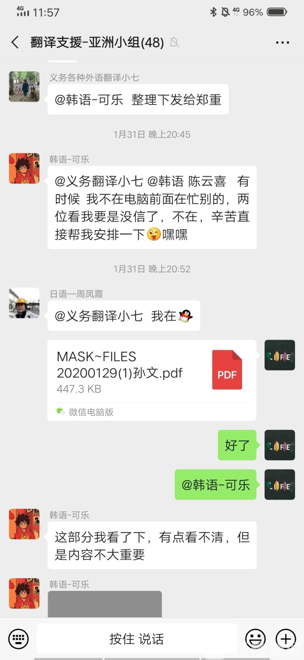 由于进出口物资主要是口罩、防护服等医疗用品及器械,专业性较强,对于毫无医疗领域翻译经验的孙文来说是一项不小的挑战。况且由于时间紧、任务重、翻译人员紧缺,一项翻译任务一般仅由一人独立完成,无人协助审核,但翻译内容却不容差错,也给了孙文不小的压力。“每次接到任务,我都要参考专业词典,反复核查,确保没有疏漏,才敢反馈给负责人。刚上手时觉得很难,翻译多了,自然就简单了许多,但还是不敢有一丝松懈,毕竟关乎医护人员的生死。”从1月30日加入翻译群以来,孙文累计完成了6项物资的翻译工作,每次翻译需要花费1到2小时不等。问及是否有翻译报酬,孙文笑道:“这个时候谁还收钱啊,我们这些大学生能在家尽一份力量就真的很开心。”朴实的话语尽显他作为青年党员的担当。