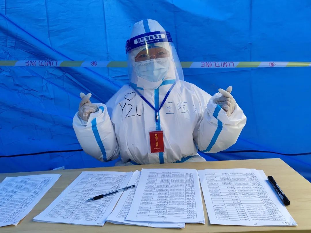 从凌晨5:30到社区接受任务,到下午1:30检测结束,王暄文不间断站立工作了8个小时,圆满完成志愿服务。王暄文的热情、专业和规范的操作受到了检测点位长和居民的一致赞誉。