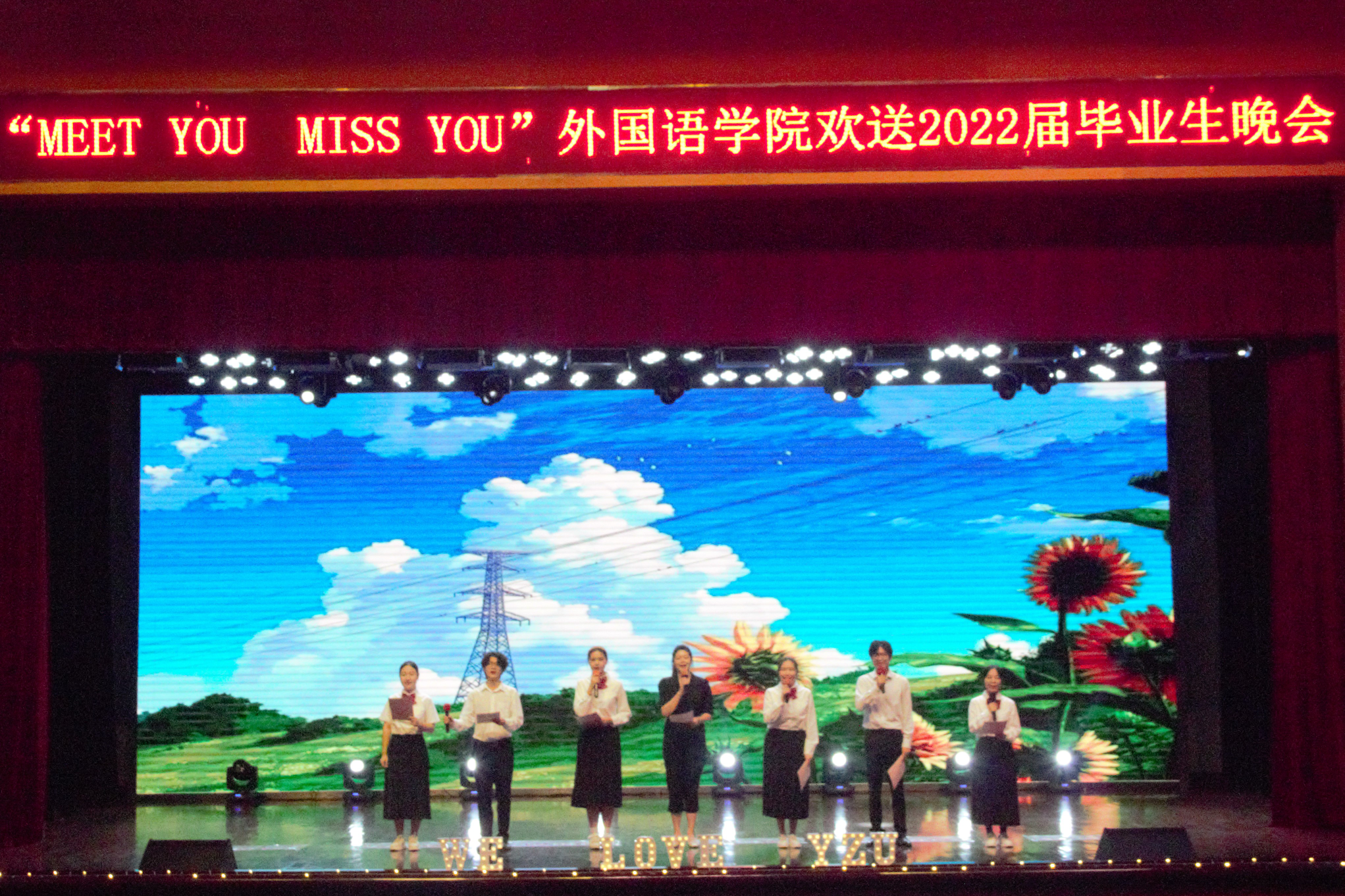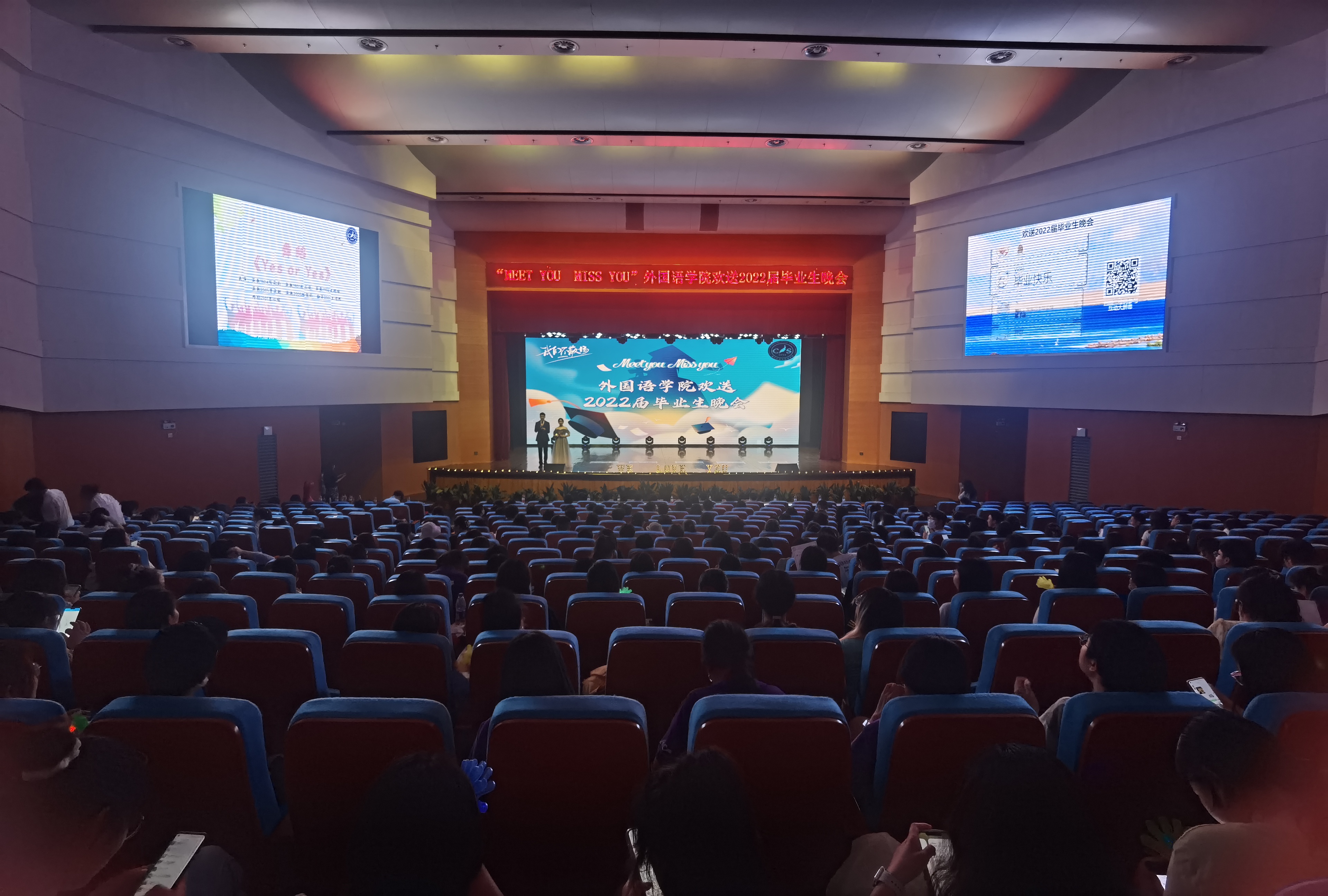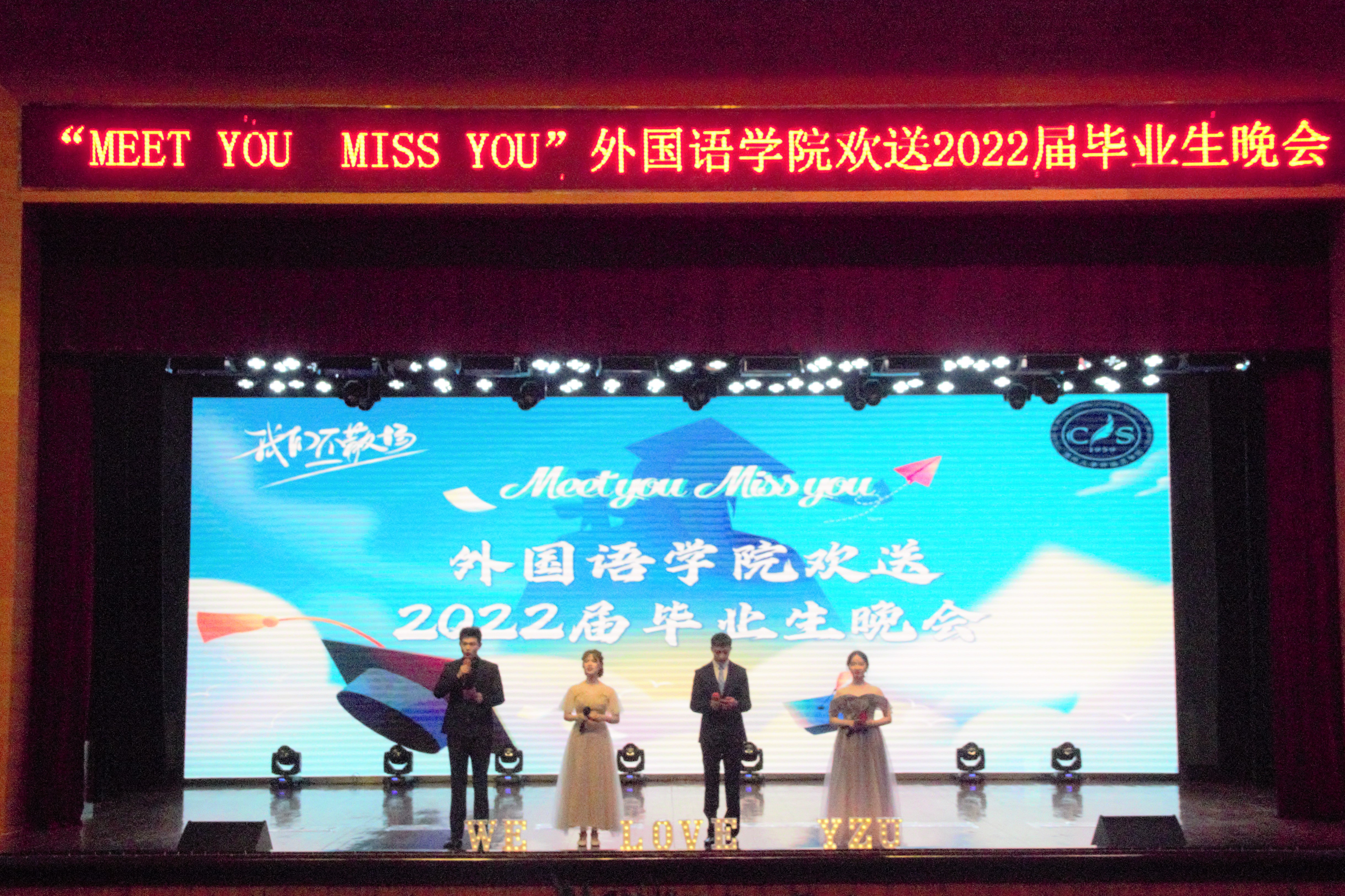 2022年6月19日晚7点,外国语学院在扬子津校区文体馆举办了“Meet you Miss you”欢送2022届毕业生晚会。扬州大学副校长、外国语言文学学科带头人俞洪亮,外国语学院党委书记赵春丹,院长王金铨,党委副书记毛连军,副院长丁晓丽、杨晓春、何山华老师出席晚会。我院各系部主任、毕业班班主任、全体辅导员、2022届毕业生参加活动。