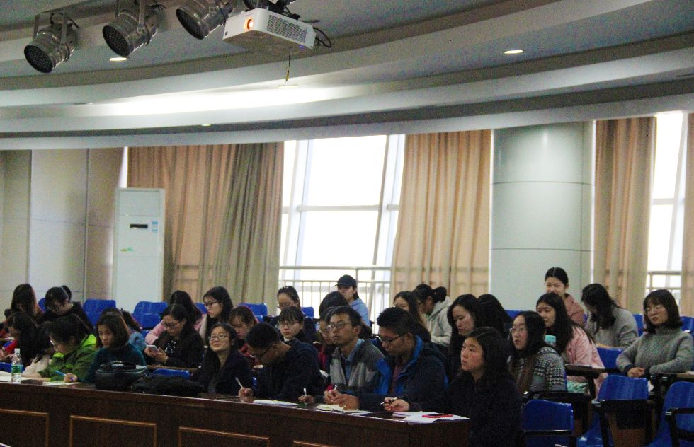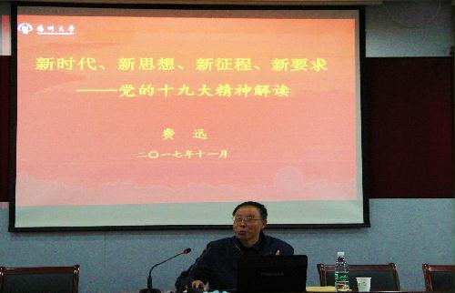 其次,费迅教授作题为《新时代、新思想、新征程、新要求---党的十九大精神解读》专题辅导报告。报告由浅入深,层层递进,分别从以下四个方面展开:第一部分是新时代的到来:此次会议是一次处于决胜阶段、关键时期的重要会议,党和国家事业正发生历史性变革,中国特色社会主义也进入了新时代;第二部分是新思想的引领:本次大会是中国共产党人对重大时代课题的系统回答,阐释了新时代中国特色社会主义思想的主要内容,提出坚持和发展中国特色社会主义的基本方略;第三部分是新征程的开启:提出了从“三步走”战略到“两个一百年”的目标,做出了新时代中国特色社会主义发展的战略安排;最后一部分是新要求的提出:要准确把握新时代的建设总要求,牢记党的政治建设是党的根本性建设。费教授深入浅出分别表达了对反腐斗争、作风建设、纪律建设等方面的真知灼见,以个人视角见微知著引导大家从新的角度对十九大报告传达的精神进行解读与学习。