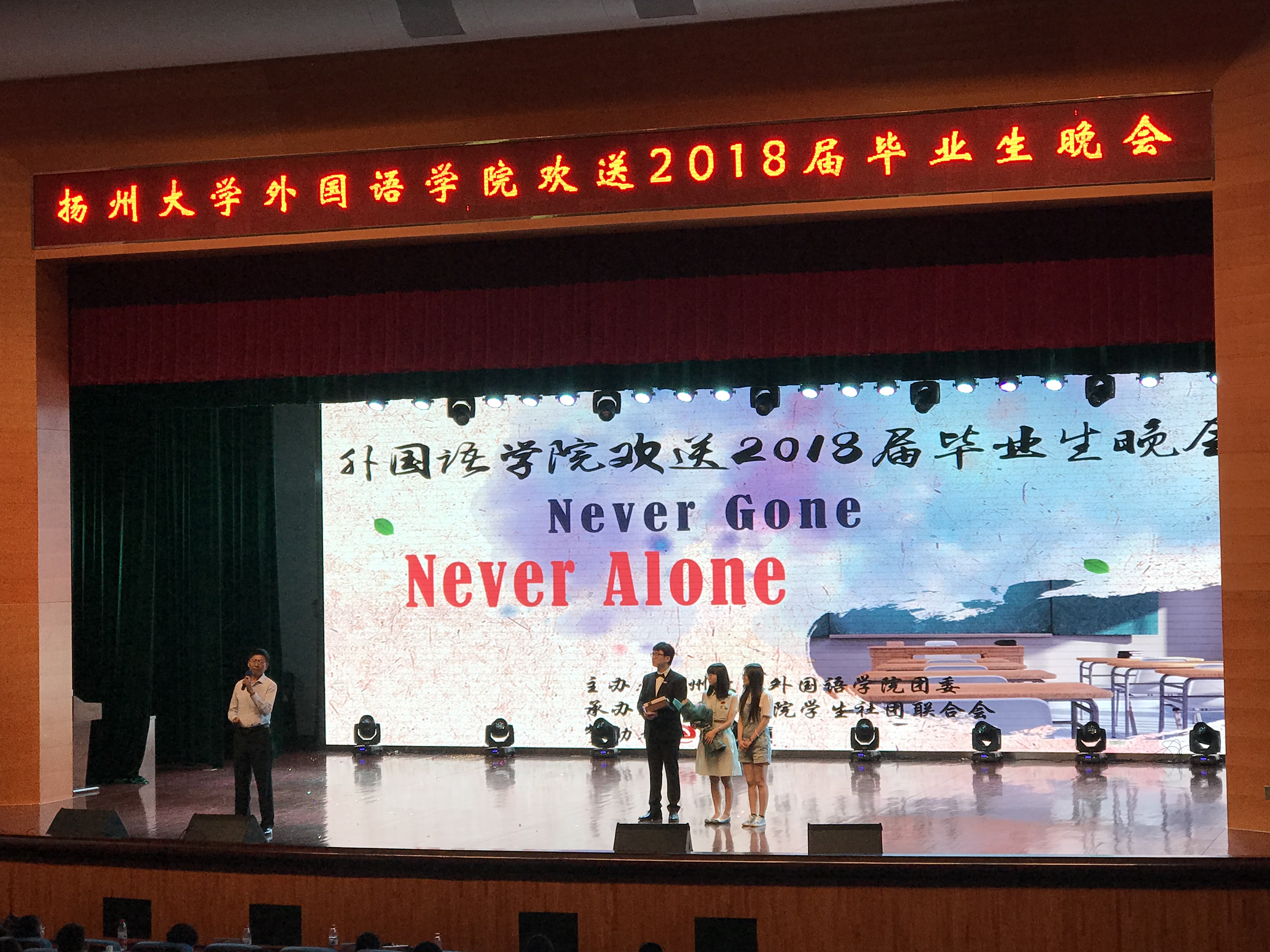 6月10日晚7点,我院在扬子津校区昭文馆举办Never Gone,Never Alone 2018届毕业生晚会。学院党委书记刘胜乐、副书记崔益军出席,院团委学工办老师、班主任、系部主任、全体毕业生及其他年级同学参加,共同见证这场盛大的毕业晚会。