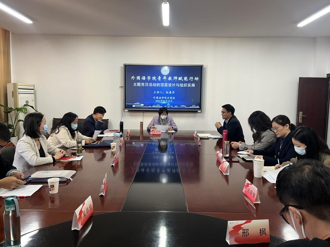 此前,外国语学院以“同心喜迎二十大,聚力奋进新征程”为主题,征集了十项活动方案。赵书记对各支部的方案进行了点评与指导。居学明书记指出,各支部要精心打磨方案,进一步提升水平。